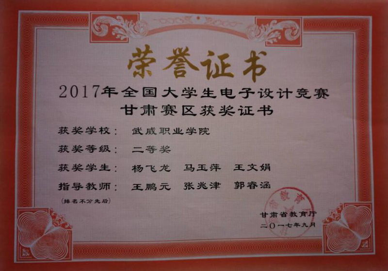 近日,2017年全国大学生电子设计竞赛甘肃赛区成绩揭晓。由电子信息工程系2016级应用电子技术专业杨飞龙、马玉萍、王文娟3名同学组成的团队在我系王鹏元、张兆津、郭睿涵3名教师指导下荣获甘肃赛区二等奖。此次获奖也是我系在优质校建设中狠抓教学科研和学生技能培养方面取得的丰硕成果。