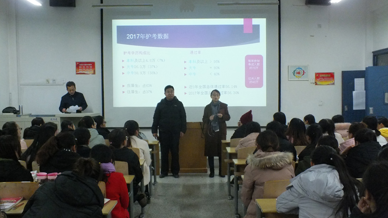 为了进一步提高我系学生的专业水平和护考过关率,让2018届毕业生更好地应对护士资格考试,12月20日晚,护理系在明远楼211教室举办了以护考为主题的讲座,15级护理、助产专业共100余人聆听了此次讲座。护理系党总支书记张建辉、系主任韩晓萍参加讲座并讲话。
