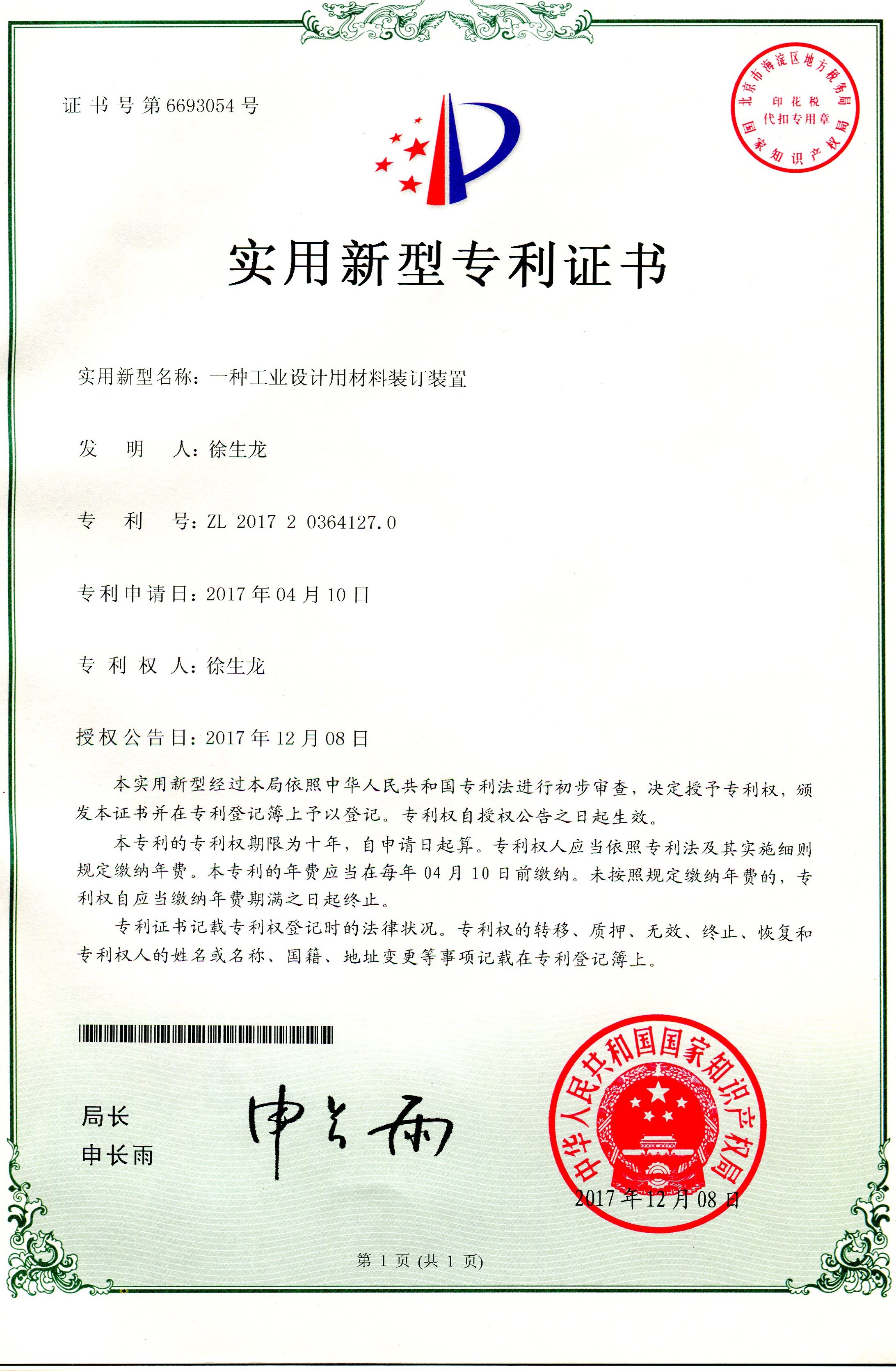 科研成果---实用新型专利:一种工业设计用材料装订装置