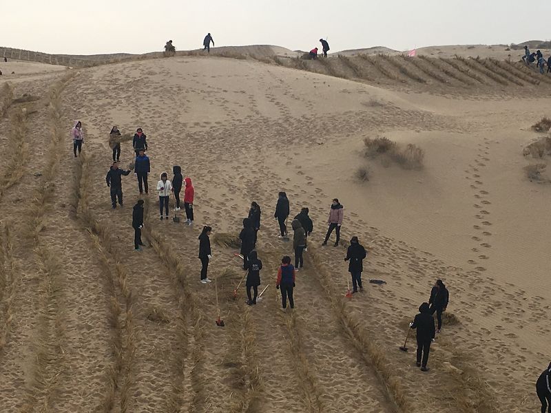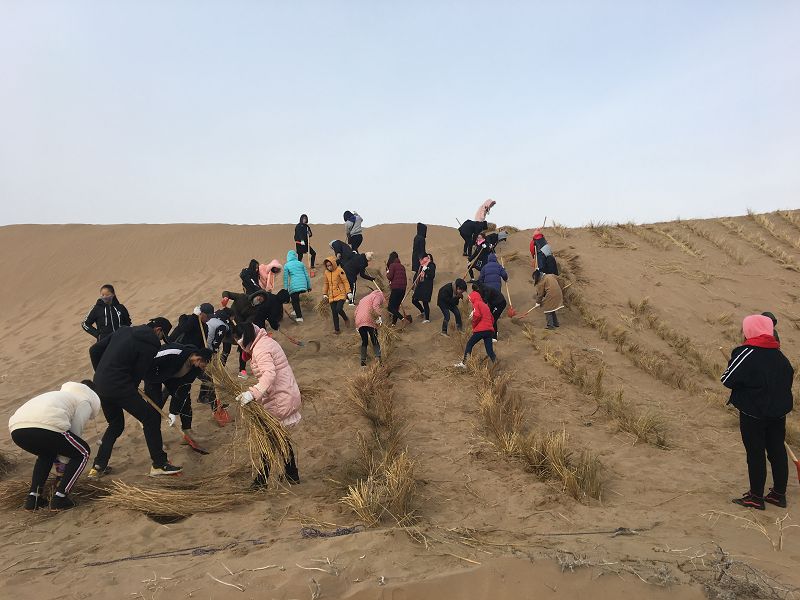 护理系学生在教师的带领下,按照技术人员制定的方法,将稻草压制成一片片固沙格。同学们发挥了不怕苦,不怕累的精神,挥动的铁锨此起彼伏,展现出了火热的劳动热情。