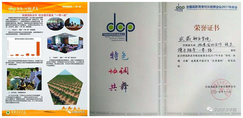 为了进一步推进优质高职院校设施农业与装备专业项目组的建设进程,我系积极组织教师学习新的教育教学理念和教学方法,积极推行专业人才培养模式、教学方法、实践教学等的改革。在11月全国高职高专校长联系会议教学成果展中,我系选送的“拓展国际合作,校企携手服务‘一带一路’”教学成果案例当选为全国教学成果优秀案例,该案例是甘肃省2017年全国高职高专校长联席会议教学成果展中唯一获奖的案例,是我系扎实推进优质高职院校建设的重大成果。