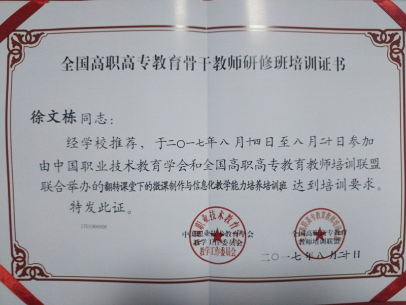 优质校建设之高校教师教学能力、信息技术与专业素养提升高级培训班总结及证书——徐文栋