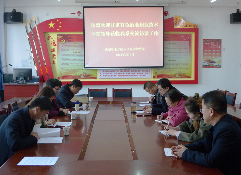 3月7日上午,甘肃有色冶金职业技术学院教育系负责人妙学春一行4人莅临我系进行交流学习,系党总支书记胡静峰、各教研室主任参加了会议。