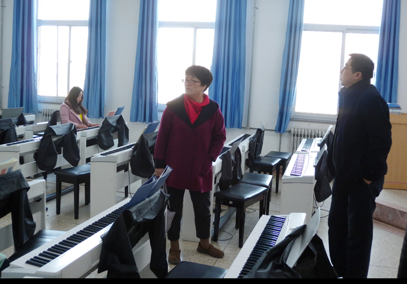 会后妙学春一行在胡静峰同志的陪同下参观了电钢琴实训室和舞蹈实训室。