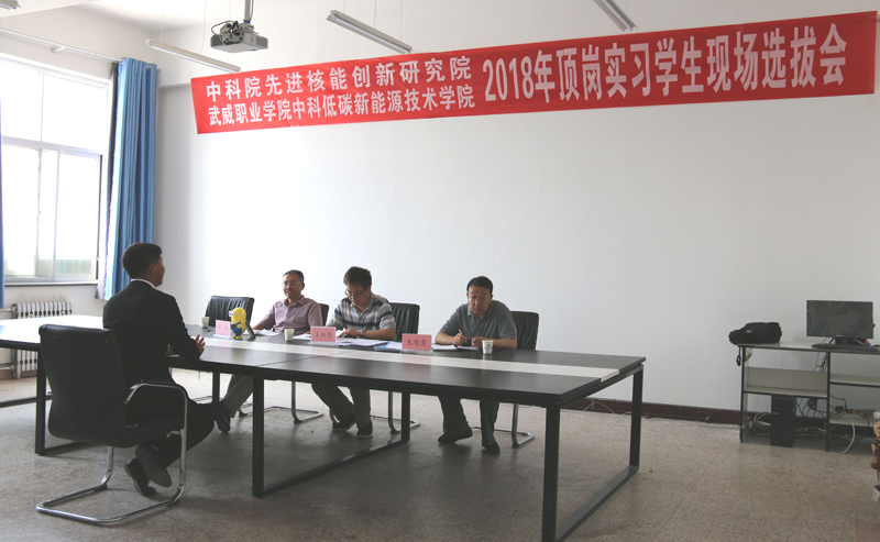 2018年6月21日,中国科学院先进核能创新研究院在学院举行了2018年顶岗实习学生现场选拨会,由中科院先进核能创新研究院综合管理部常务副主任王纳秀、熔盐机械部热工组组长王晓和中科武威新能源研究所所长朱智勇组成的专家组对能源类专业和机械类专业学生进行了现场面试,遴选出的14名同学将于7月份前往中国科学院先进核能创新研究院进行为期一年的专业顶岗实习,他们将在中科院先进核能创新研究院专家教授的带领下,通过一对一指导和岗位轮训等形式全面系统完成顶岗实习,了解行业技术需求和技术最新进展,掌握更多的专业知识和实践技能,感受顶级科研院所深厚的科技氛围和文化氛围,全面提升专业水平和综合素养,为成功走向社会奠定良好的基础。