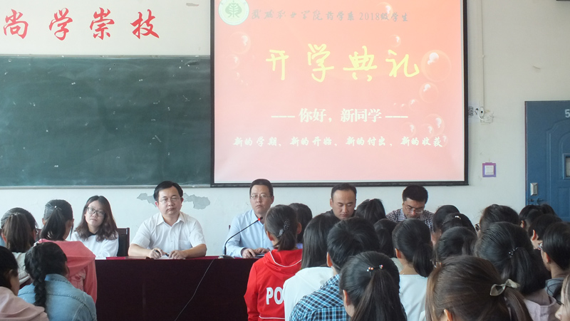 9月3日,药学系在明远楼501室召开2018级新生开学典礼暨军训动员大会。药学系主任魏润明、副主任杨建美、各教研室主任、全体班主任及176名2018级新生出席了本次典礼。开学典礼由杨建美主持。