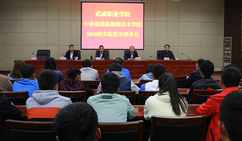 9月17日晚,武威职业学院中科低碳新能源技术学院2018级“实验班”开班典礼在学院行树楼北侧报告厅隆重举行。学院副院长翟存祥、能源工程系党总支书记黄文源、能源工程系副主任黄述杰、机械工程系副主任申宾德、实验班全体任课教师和同学参加了开班典礼。典礼由能源工程系副主任黄述杰主持。