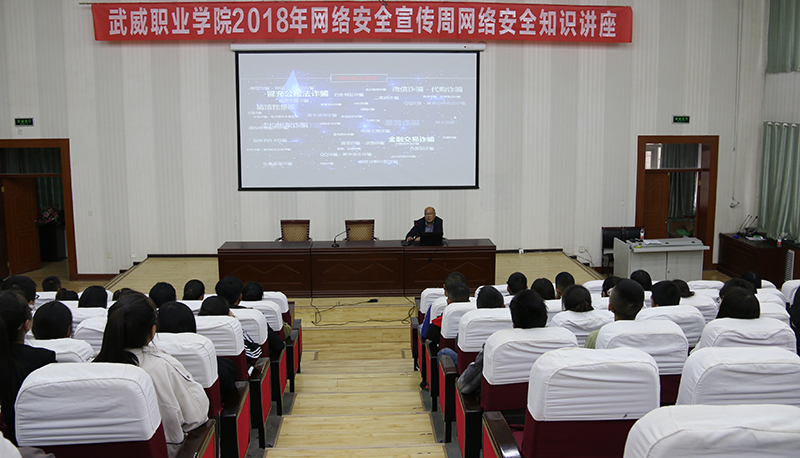 为深入学习宣传贯彻习近平总书记在全国网络安全和信息化工作会议上“深入开展网络安全知识技能宣传普及,提高广大人民群众网络安全意识和防护技能”的重要讲话精神,按照甘肃省教育厅、武威市网信办关于开展2018年国家网络安全宣传周活动的要求。9月18日下午,学院在正德厅举办了“网络安全与《网络安全法》”的专题讲座,师生代表200余人参加。