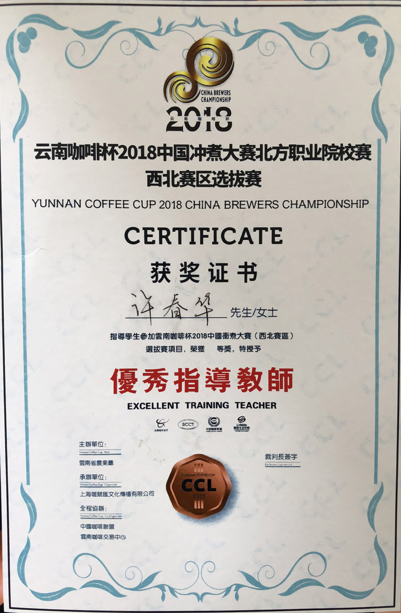 我院学生荣获“云南咖啡杯2018中国冲煮大赛北方职业院校赛西北赛区选拔赛”季军