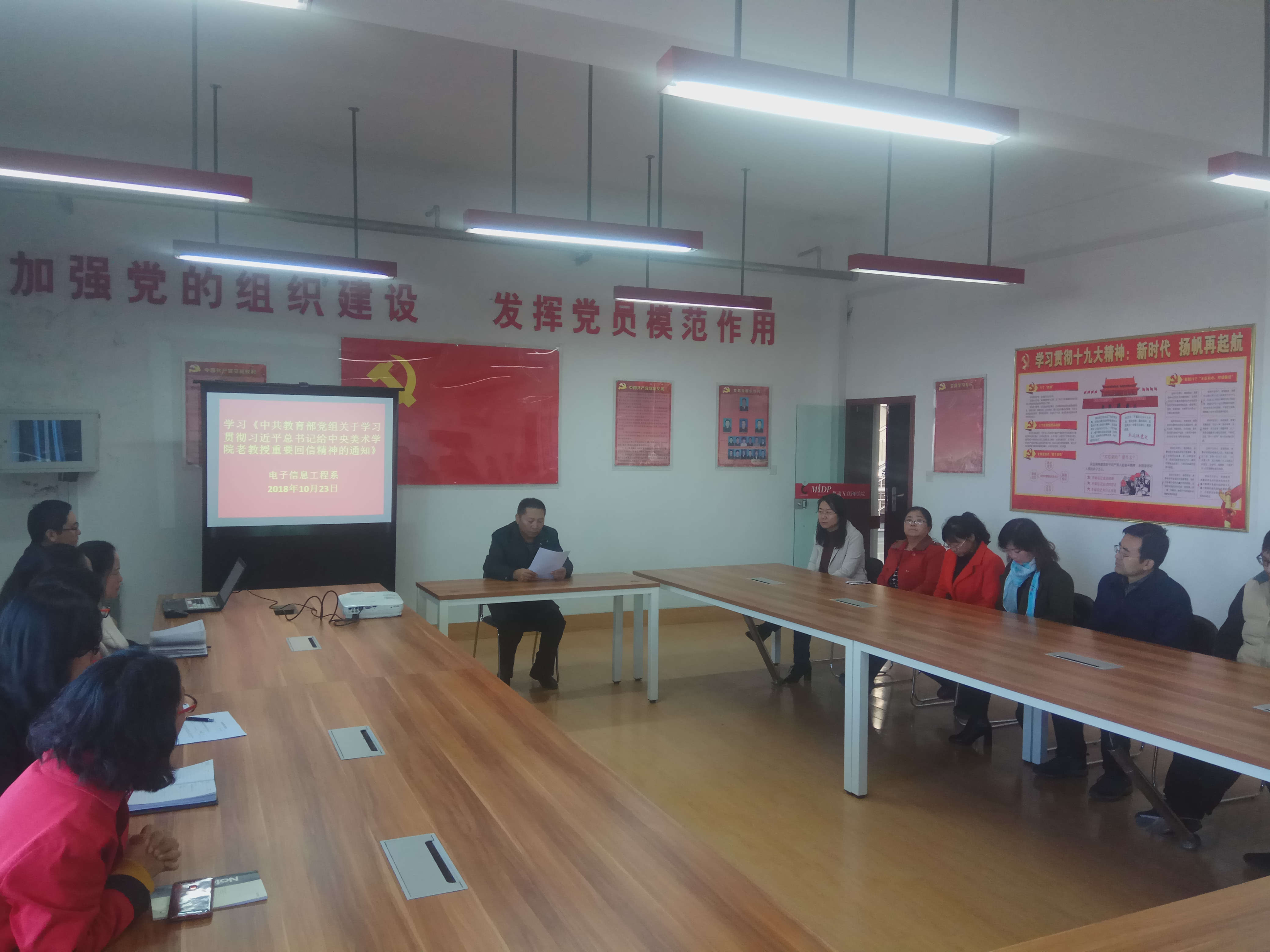 根据学院组织人事处转发《中共教育部党组关于学习贯彻习总书记给中央美术学院老教授重要回信精神的通知》的通知要求,电子信息工程系于10月23日召开教职工大会,开展对习近平总书记回信精神的学习。