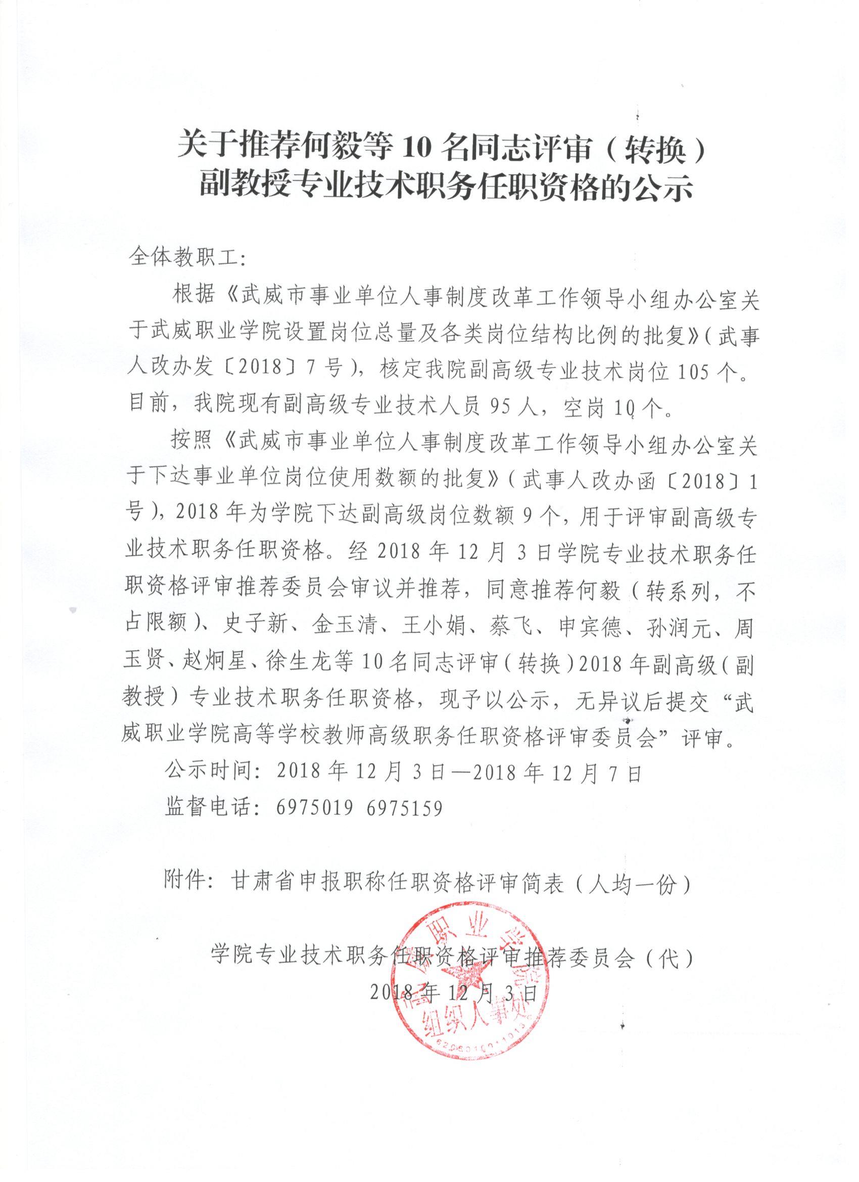 关于推荐何毅等10名同志评审(转换)副教授专业技术职务任职资格的公示