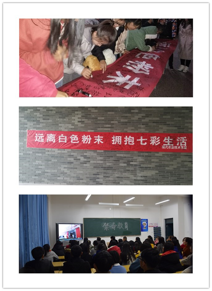 现代农业技术系结合自身实际和条件,重点开展了以下活动。一是通过在行树楼张贴“远离白色粉末拥抱七彩生活”禁毒横幅,号召全系师生创建和谐、文明、无毒的校园环境;二是各班开展了禁毒宣传主题班会,宣传毒品危害,普及防毒知识,警示大家珍爱生命,远离毒品;三是组织学生参加学院禁毒征文大赛,用语言表达禁毒的决心;四是团学会组织各班同学网上参观“中国禁毒数字展览馆”,观看禁毒题材的优秀微电影《一路有你》、《少年的秘密》、《蜕变》、《爱心带你回家》,让在场同学深刻感受到毒品的危害,坚定了同学们禁毒防毒的信心。