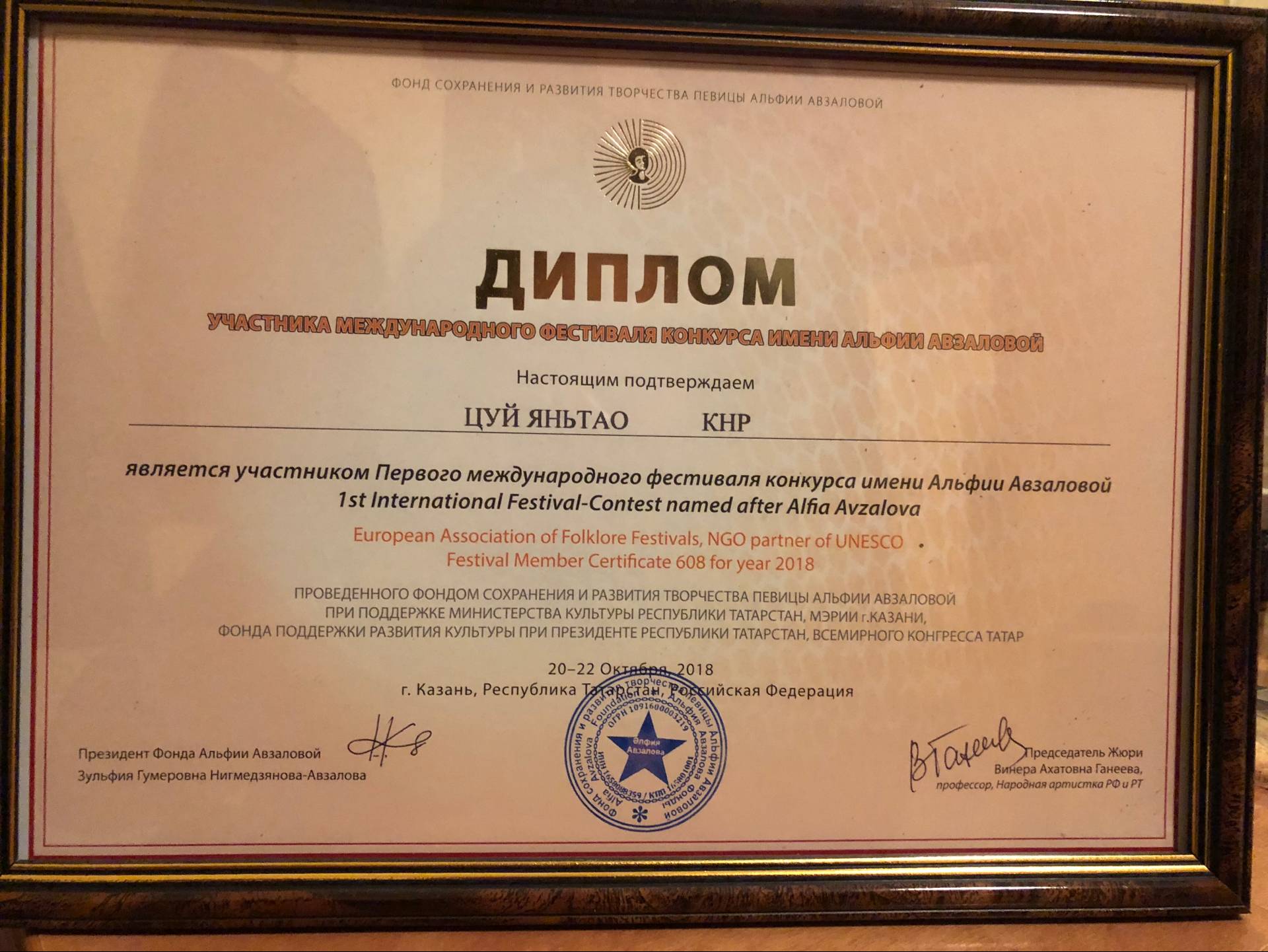 1.在以阿菲亚·阿夫扎洛娃命名的第一届国际比赛节(First international contest festiva Named After Alfia avzalova)获得二等奖,一等奖空缺。