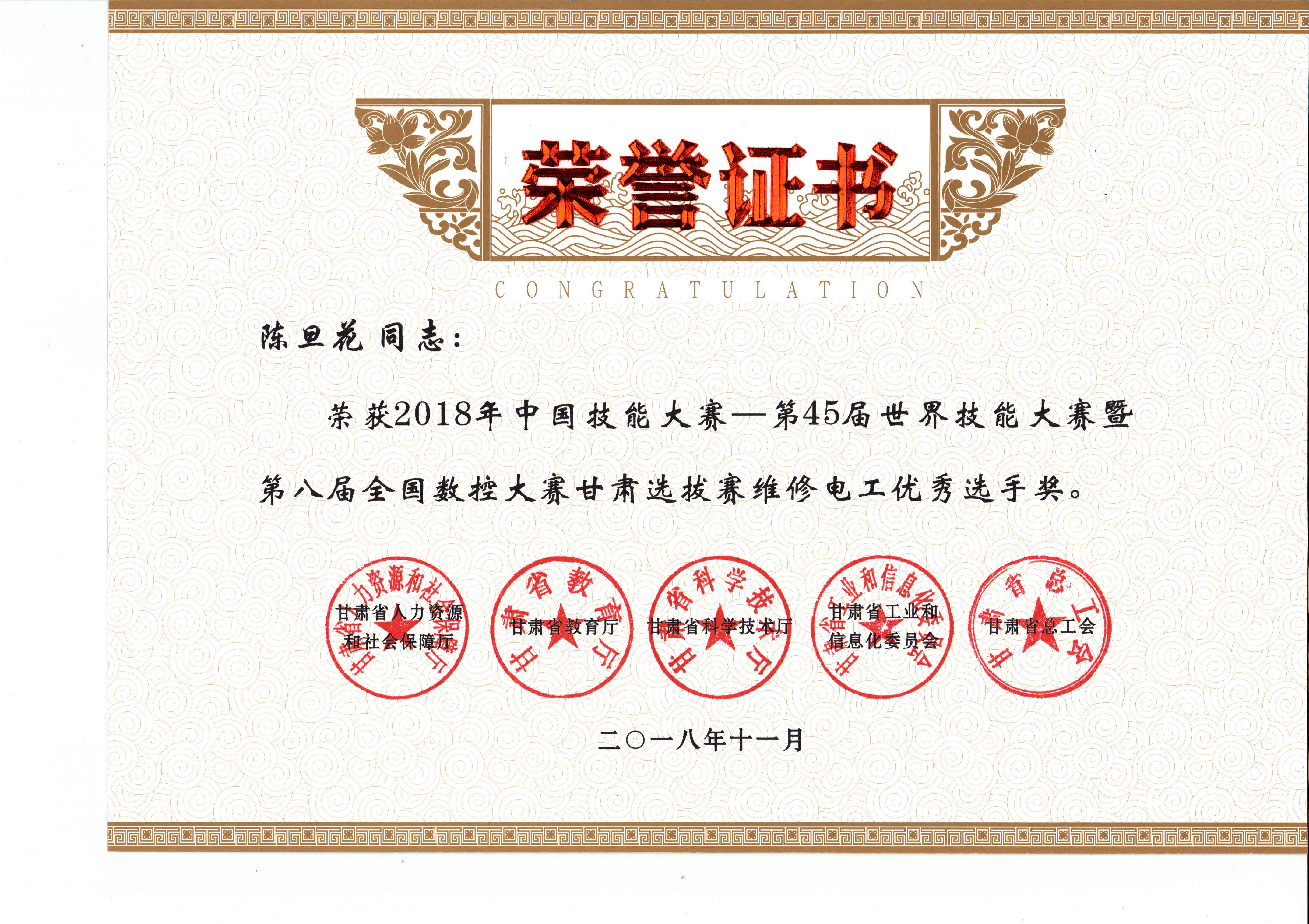 2018年中国技能大赛--第45届世界技能大赛暨第八届全国数控大赛甘肃选拔赛(维修电工项目)获奖证书