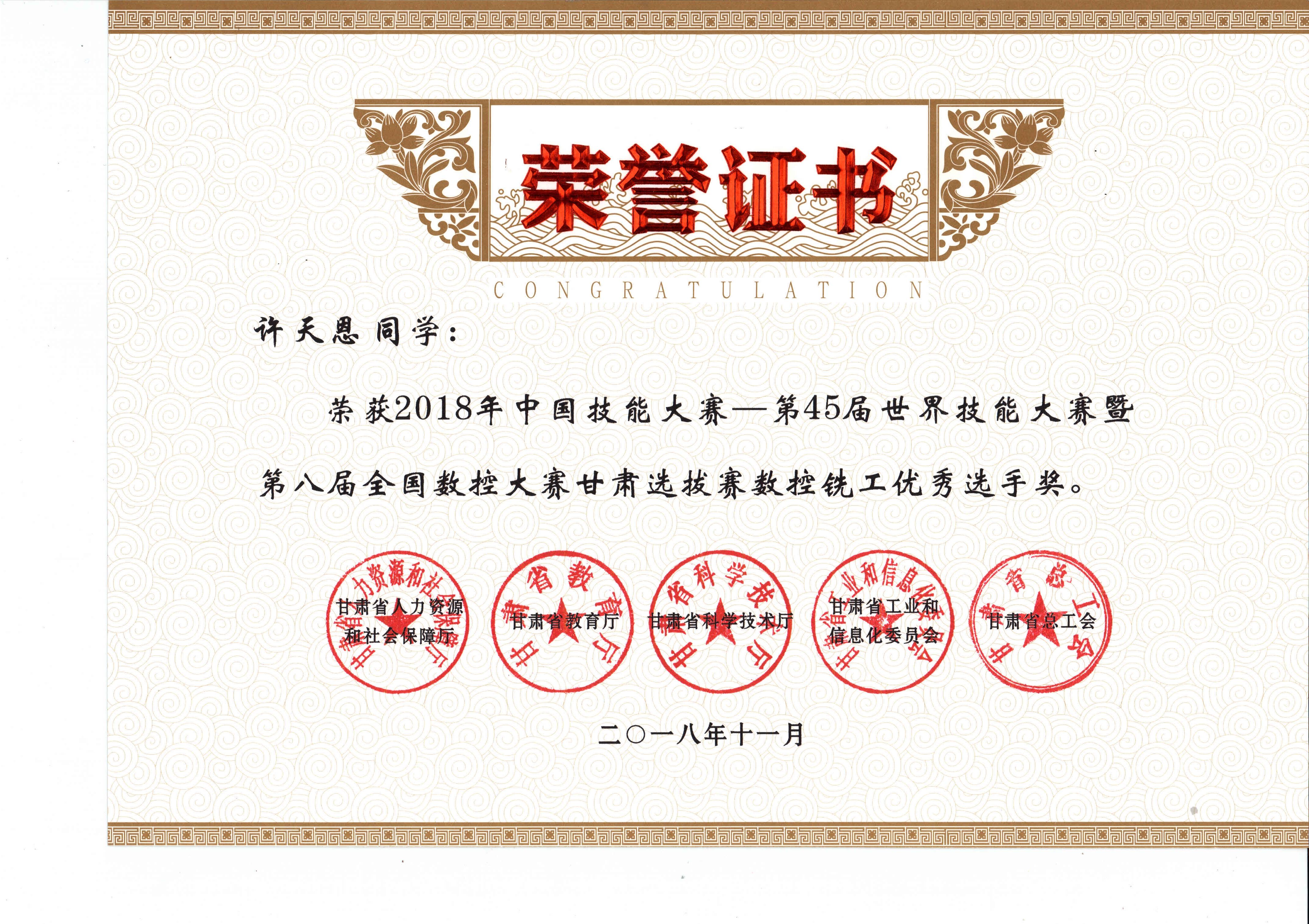2018年中国技能大赛--第45届世界技能大赛暨第八届全国数控大赛甘肃选拔赛(数控铣工项目)获奖证书