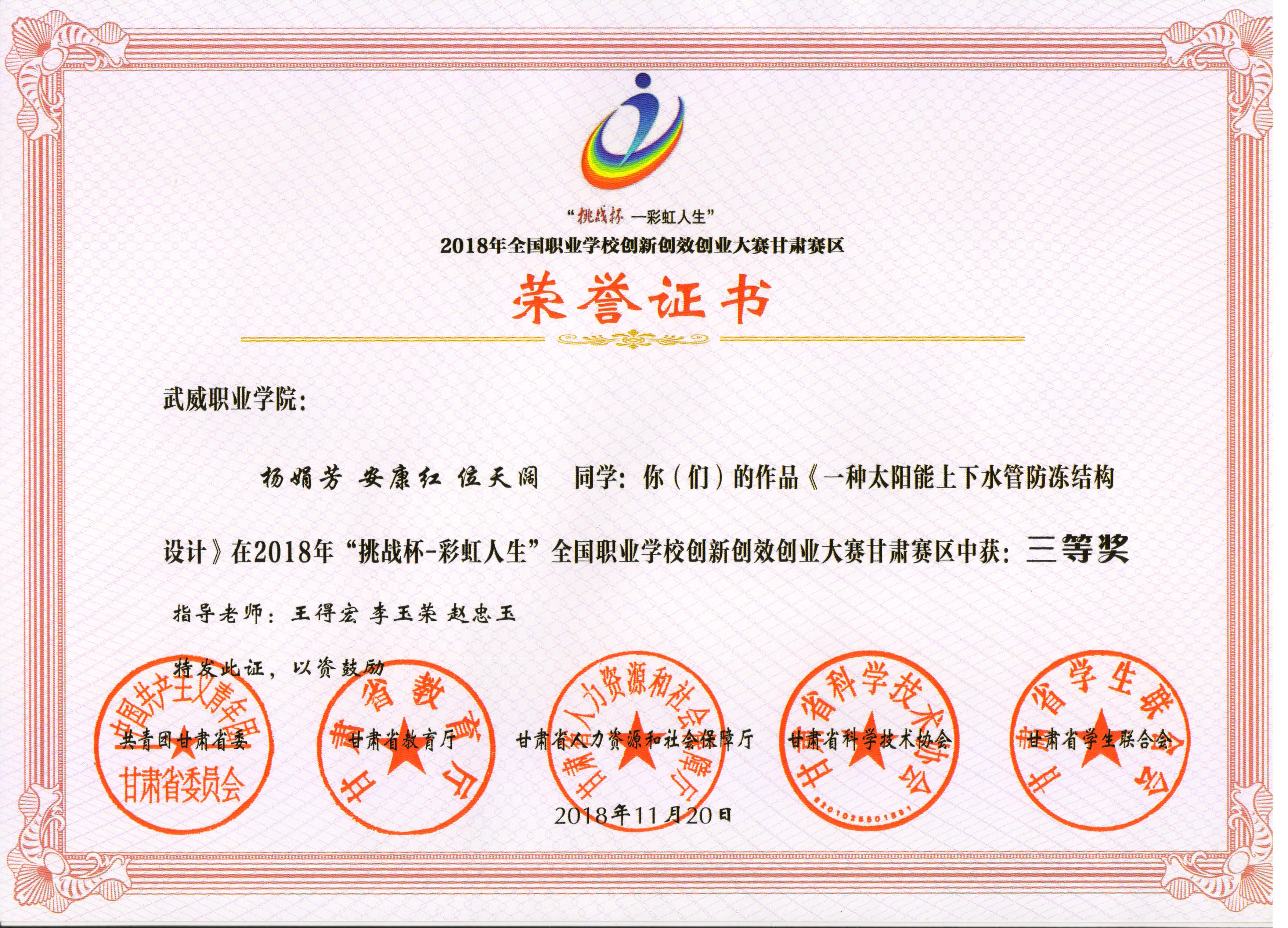 2018年“挑战杯--彩虹人生”全国职业学校创新创效创业大赛甘肃赛区三等奖