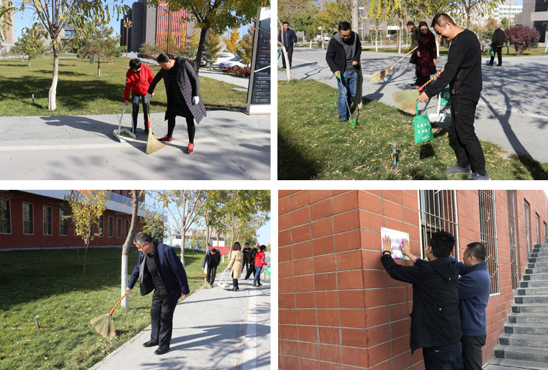 支部全体党员在大学生活动中心门口、风雨操场及校园马路清扫落叶和垃圾,并对沿线卫生死角进行清理,对不文明行为进行即时劝导。在教学楼、活动中心、公寓楼、食堂等建筑物的醒目位置张贴20余张“创建文明校园”、“禁止吸烟”等标志。通过开展“创建文明校园”活动,进一步提升我院“创建文明城市”迎检和“创建文明校园”活动效果。