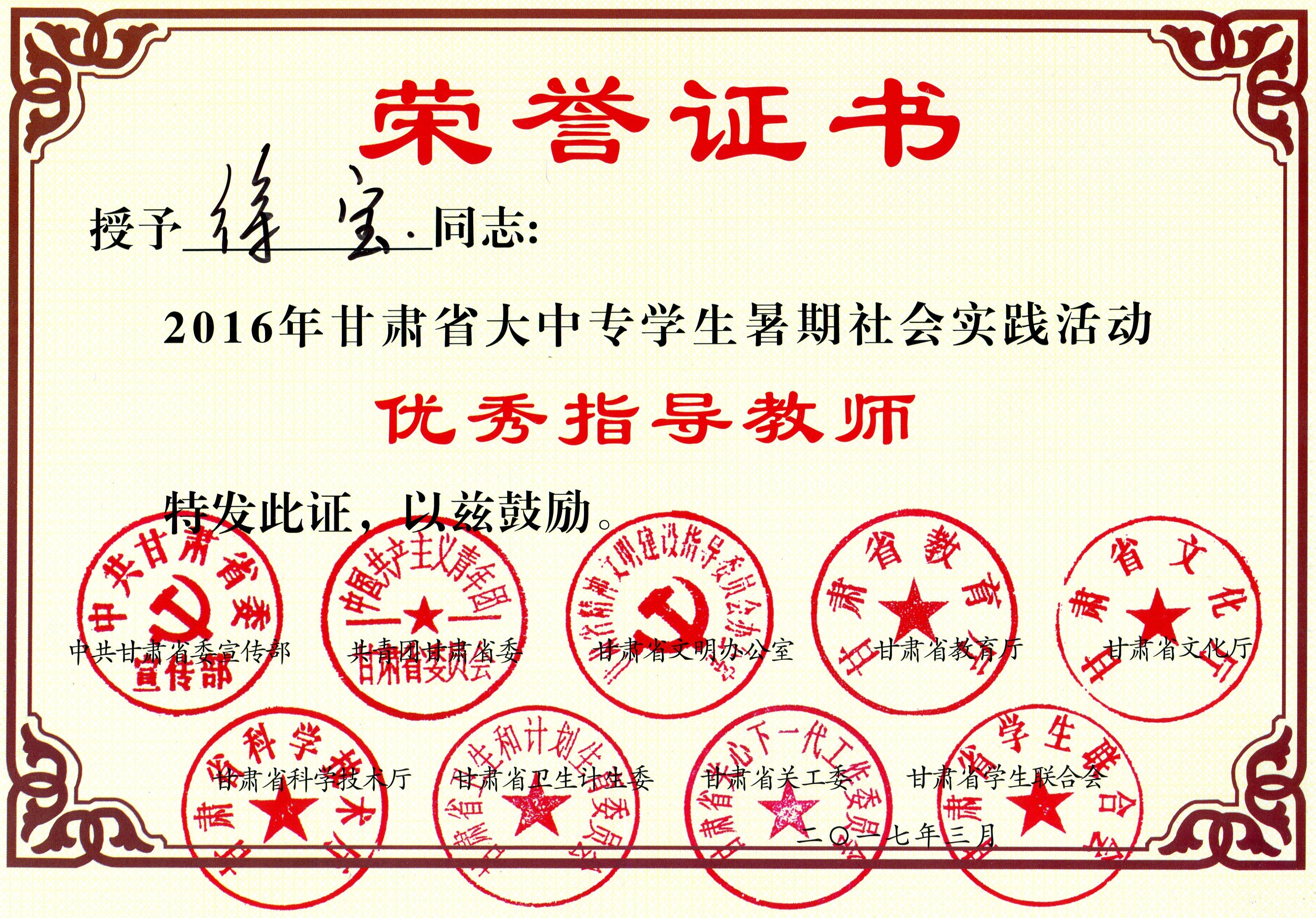 甘肃省大中专学生暑期社会实践活动优秀指导教师