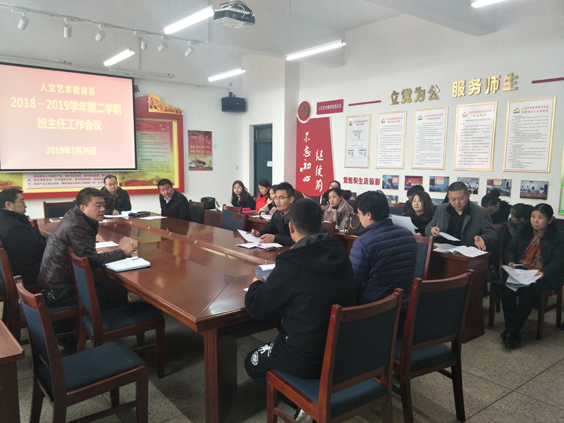2月26日,人文艺术教育系全体班主任和学生工作管理人员在励勤楼209会议室,召开新学期学生管理工作会议,会议由系党总支书记胡静峰同志主持,系副主任李欣做具体工作安排。