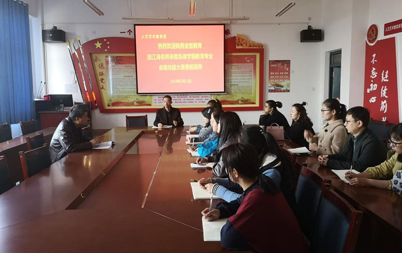 2019年3月13日下午,人文艺术教育系邀请陕西金智教育集团讲师、山西省“国培计划”学前教育专业领域客座讲师田江涛老师到我系进行了学前教育专业省级技能大赛专题培训讲座,并对2019年甘肃省职业院校学前教育专业技能比赛的流程进行了指导。系副主任李欣、各专业教师及参赛学生参加。