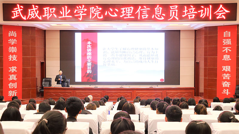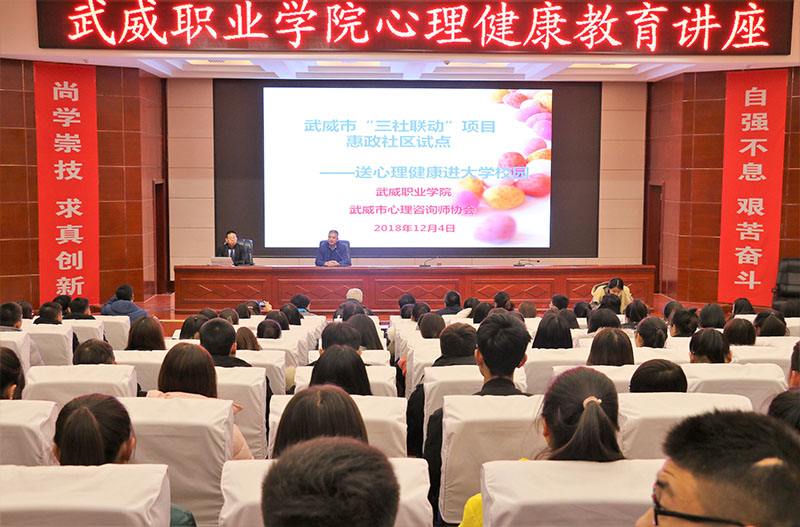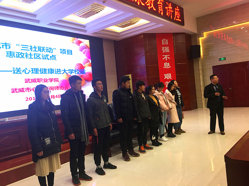 12月4日晚上,学生工作处联合武威市“三社联动”惠政社区试点项目在学院菁英厅举办了心理健康专题讲座暨心理信息员培训。此次讲座邀请武威市心理咨询师协会会长何飞老师主讲,学院各系辅导员、2017级、2018级班级心理信息员、心翼心理社团会员等220多人聆听了讲座。学生工作处处长王守云主持活动。