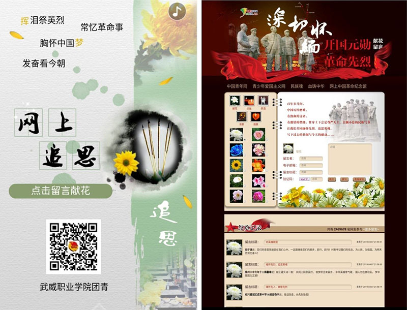 院团委在“武威职业学院团青”微信公众平台开设清明网上祭英烈专栏,共有3968名同学参与了线上活动。同学们带着诚挚的敬意向烈士们鞠躬、献花,并在留言区发表祭扫寄语,以此缅怀先烈的丰功伟绩,追忆烈士之德。