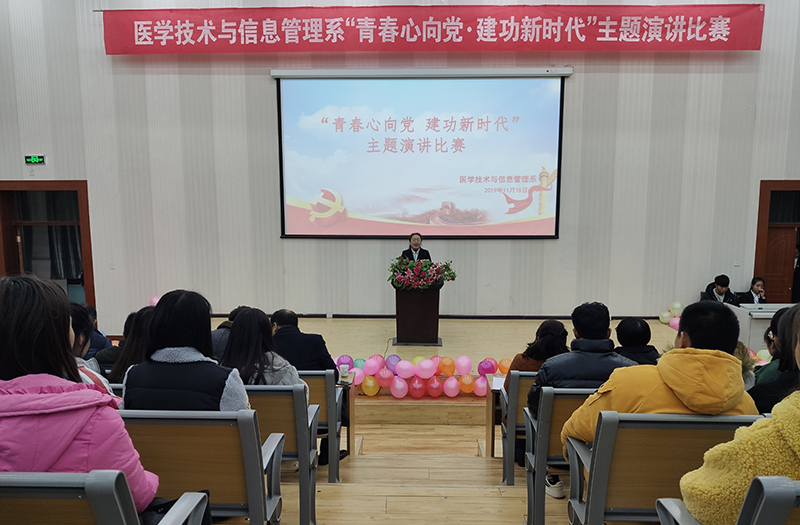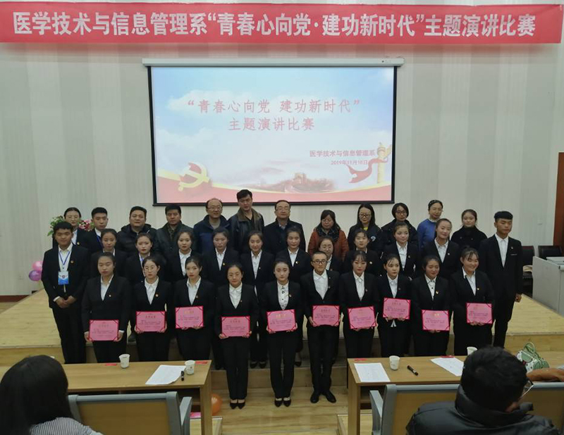 为深入贯彻落实习近平新时代中国特色社会主义思想,党的十九大、十九届四中全会精神,不断扎实推进“不忘初心、牢记使命”主题教育,11月18日,医学技术学院分团委主办的 “青春心向党、建功新时代”主题演讲比赛在正德厅举行。系党总支书记黄文源,主任杨如松,全体班主任及2019级280名同学参加了本次演讲比赛。