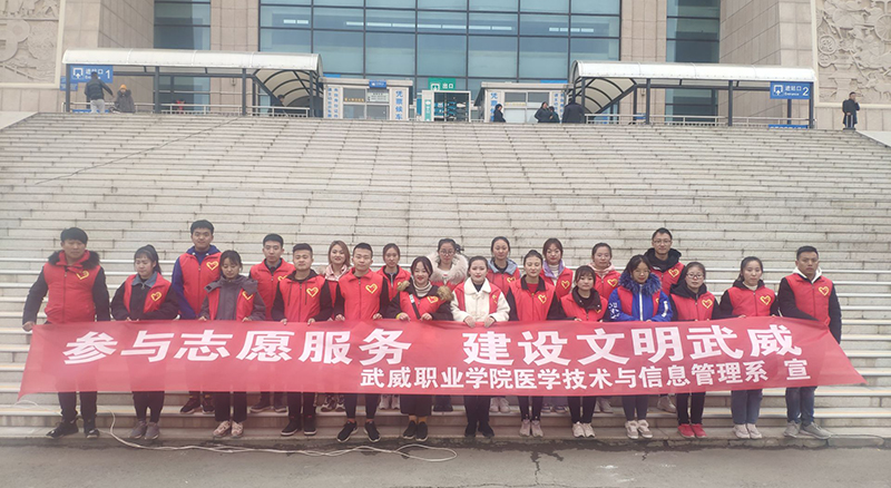 为强化大学生思想道德素质和志愿服务精神,增强大学生奉献服务精神,创建和谐、文明、美丽校园,11月23日,武威职业学院医学技术学院团总支书记石瑞山老师带领系分团委、学生会骨干及18、19级入党积极分子在武威市火车站、汽车站开展了以“参与志愿服务,建设文明武威”为主题的志愿者服务活动。