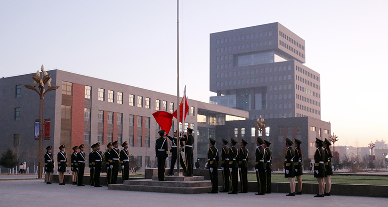 上午7时50分,国旗班踏着铿锵有力的步伐步入升旗台,鲜红的五星红旗在雄壮的国歌声中冉冉升起。警笛鸣响,在场师生肃立,为遇难同胞默哀致敬。26名学生代表深情朗诵《和平宣言》,代表学院全体师生发出庄严的和平宣言。
