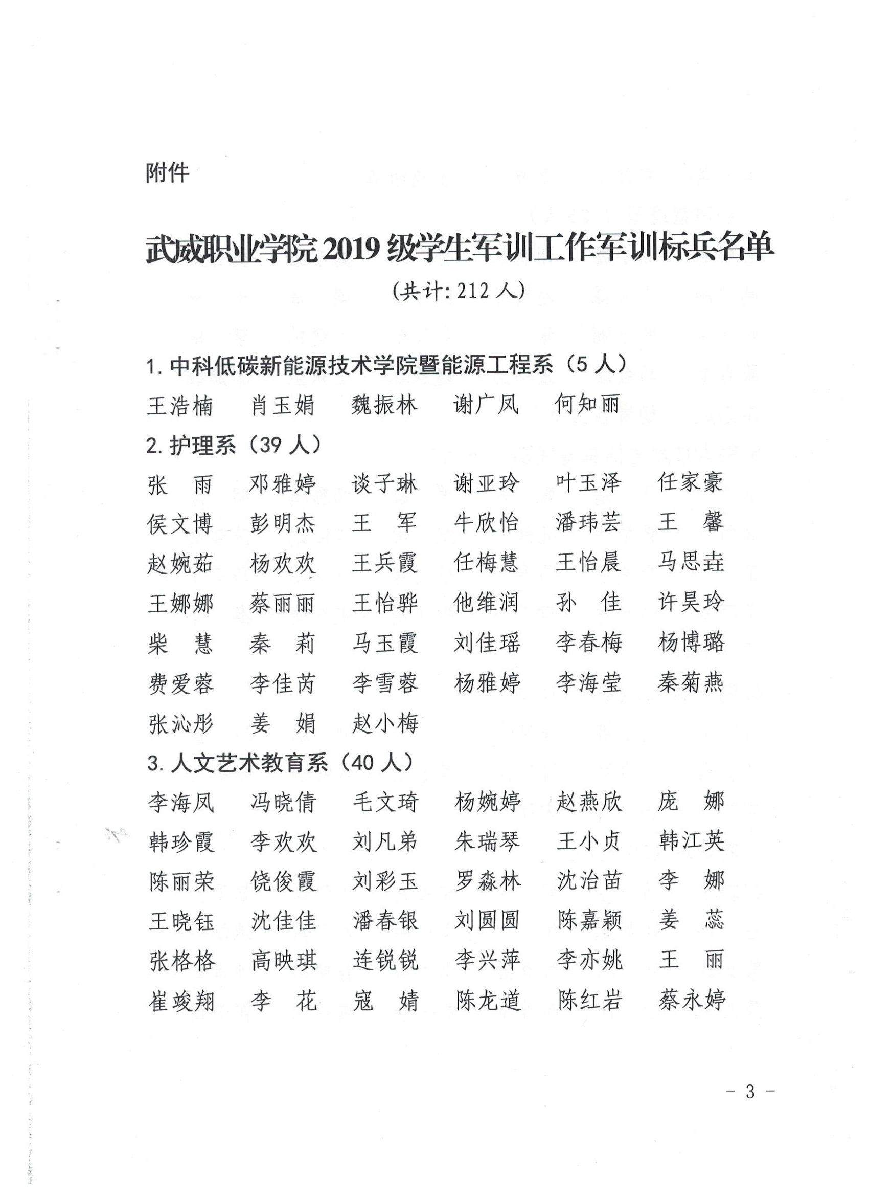 武威职业学院关于表彰2019级学生军训工作军训标兵的决定
