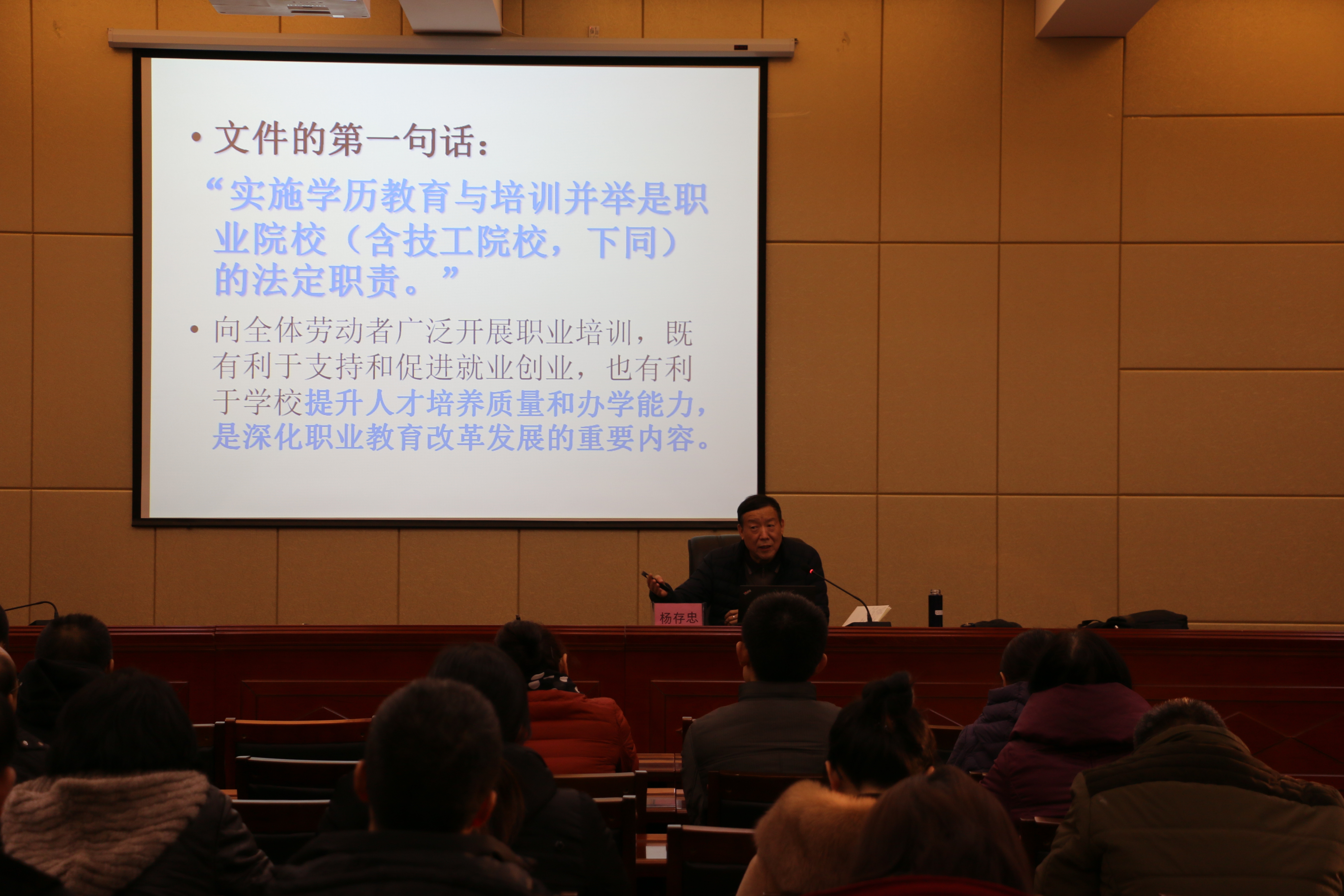 针对教育部11月25日发布的“关于做好《职业院校全面开展职业培训 促进就业创业行动计划》实施工作有关事项的通知”的文件(以下简称《行动计划》),杨教授从《行动计划》出台的背景和意义、职业院校的法定职责、职业院校普遍存在的问题、《行动计划》对职业院校提出的重点任务和行动措施以及如何推进贯彻落实《行动计划》等五个方面和大家进行了学习分享。杨教授强调,深化职业教育改革发展,职业院校敞开校门,广泛开展培训工作,服务社会发展,是职业院校的法定责任,也是学院可持续发展和生存的必然趋势。《行动计划》对职业院校提出了十个方面的行动措施一是广泛开展企业职工技能培训。二是积极开展面向重点人群的就业创业培训。三是大力开展失业人员再就业培训。四是做好职业指导和就业服务。五是推进培训资源建设和模式改革。六是加强培训师资队伍建设。七是支持多方合作共建培训实训基地。八是完善职业院校开展培训的激励政策。九是健全参训人员的支持鼓励政策。十是建立培训评价与考核机制。杨教授希望大家能够学好文件并认真思考学院的改革发展。把立德树人、服务发展、促进就业、适应需求的办学理念传承下去。
