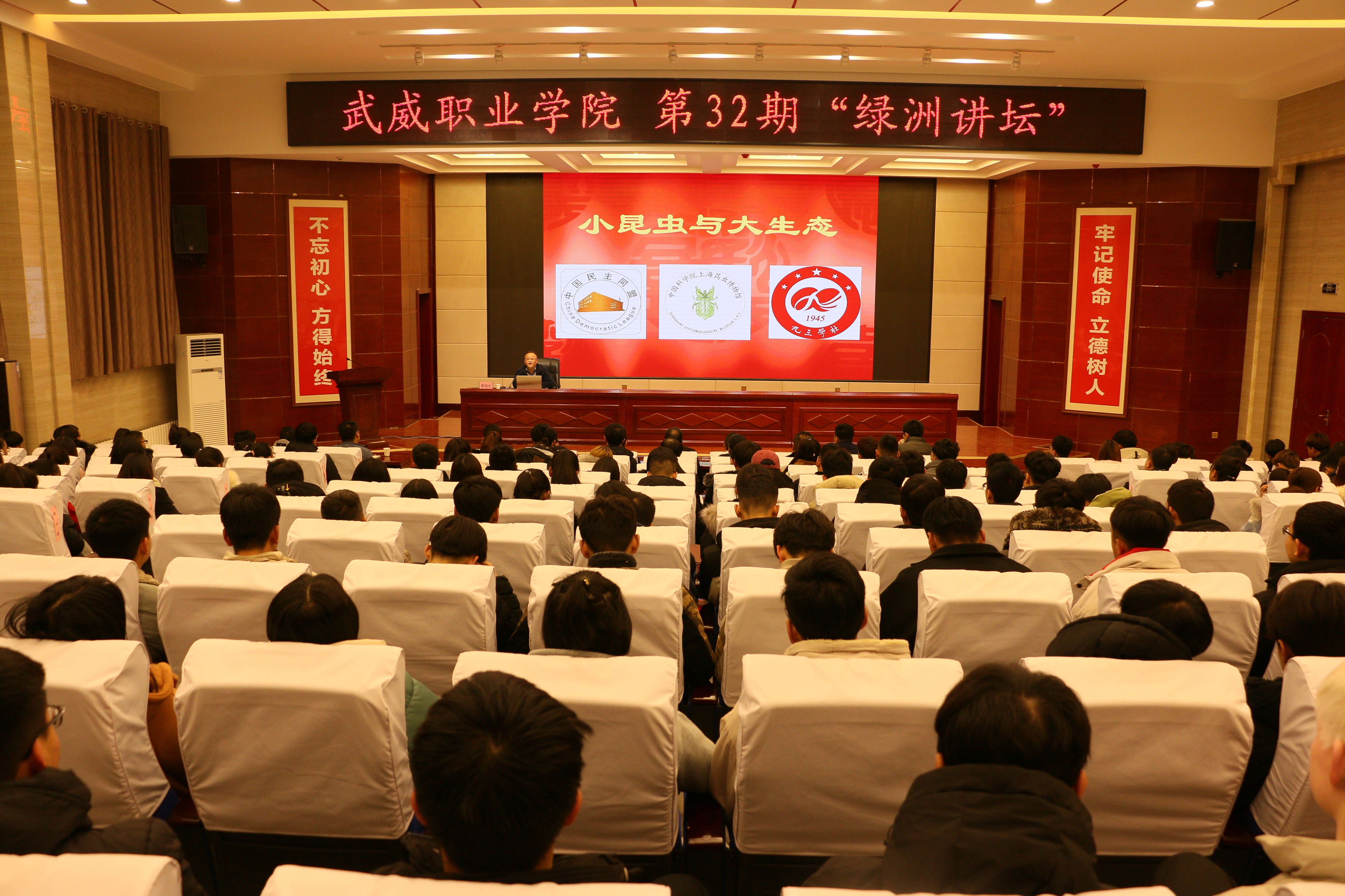 12月18日,武威职业学院“绿洲讲坛”第32期在学院菁英厅举行,本期活动邀请到中国科学院上海昆虫博物馆馆长殷海生教授作主题为“小昆虫与大生态”的报告。学院现代农业技术系相关专业学生、中科低碳新能源技术学院师生代表共220人聆听了报告。本期讲坛由能源工程系党总支书记胡建宏主持。