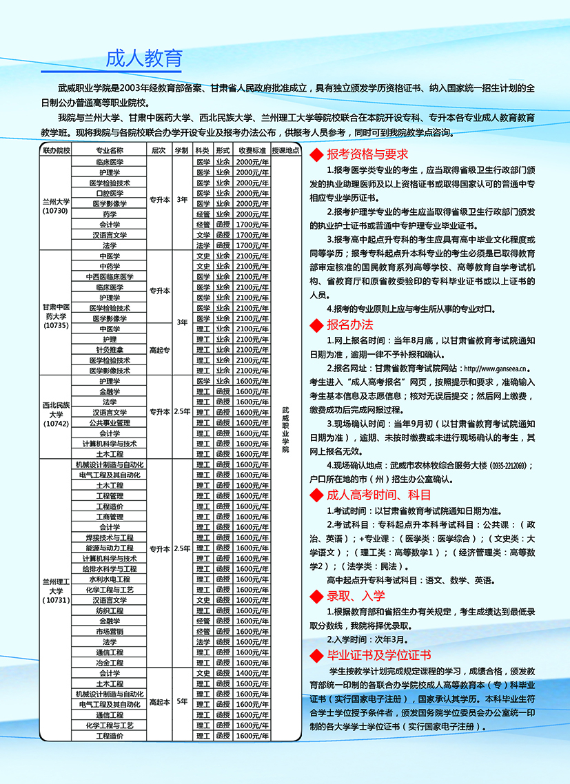 武威职业学院继续教育学院2020年招生简章