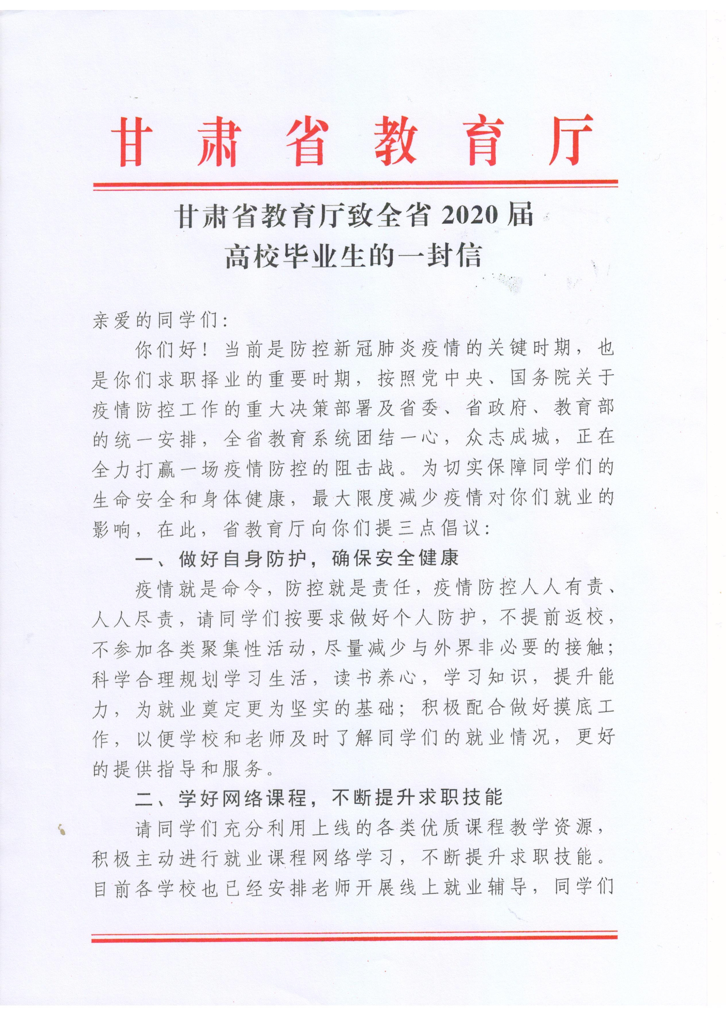 甘肃省教育厅致全省2020届高校毕业生的一封信