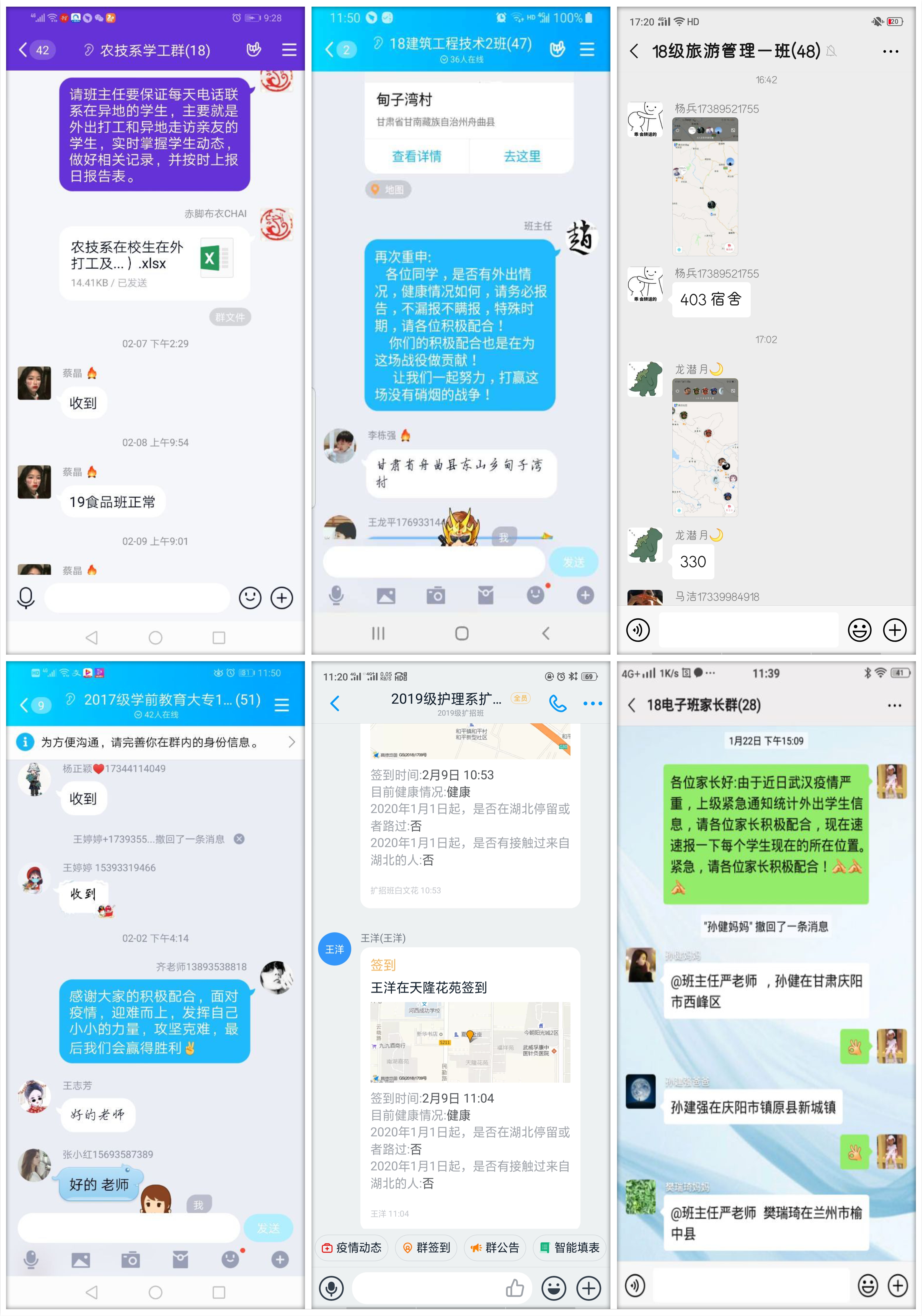 各院系辅导员和班主任每天都会不厌其烦的利用微信群、QQ群、钉钉群、电话等方式督促学生反馈动向和健康信息,清楚每一位学生当日在何处,清楚每一位学生当日是否健康,认真核查确认疫情数据信息,力求上报的每个疫情数据统计准确无误,为学校和上级部门的防控工作提供有力的数据支撑。