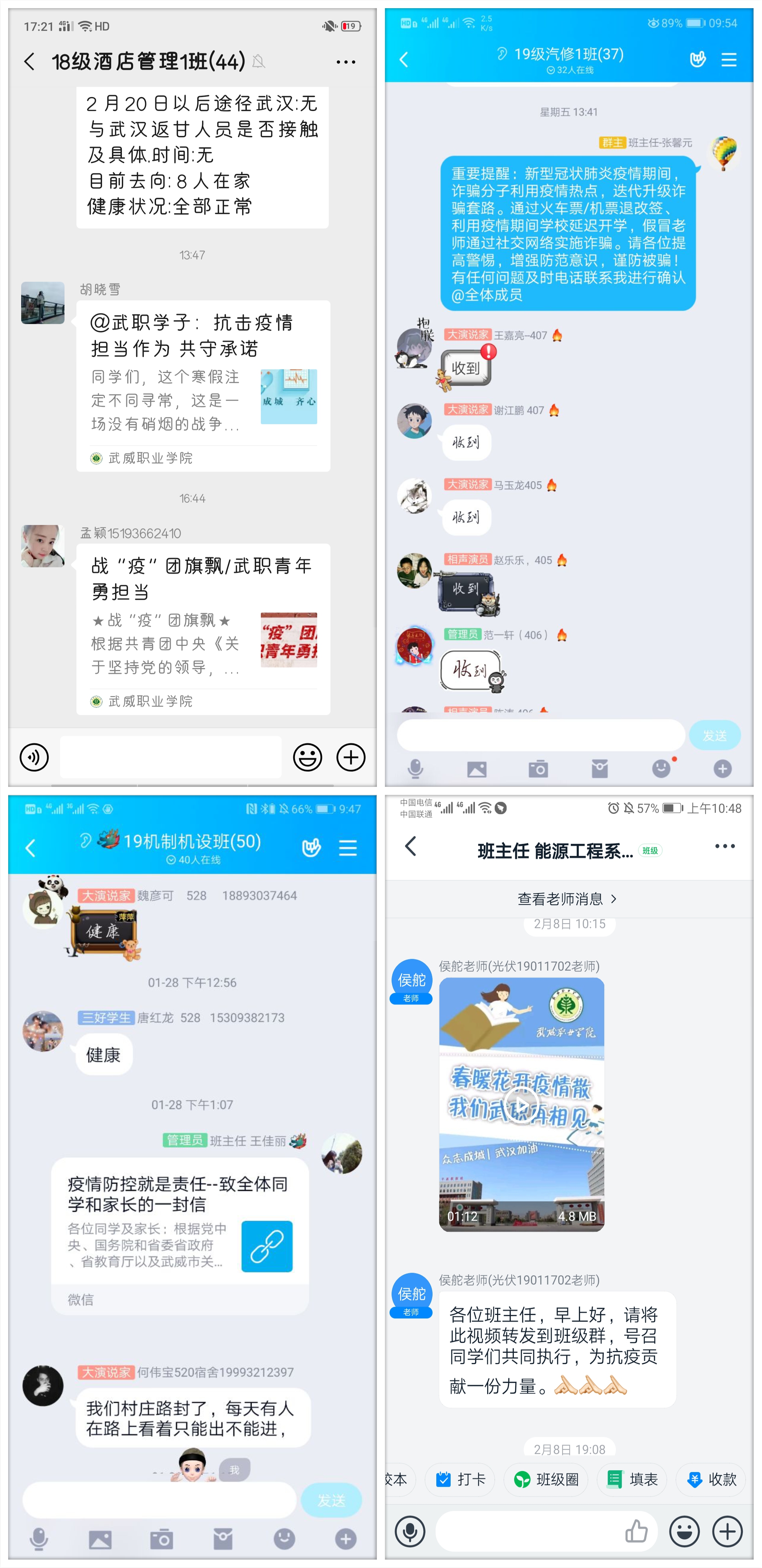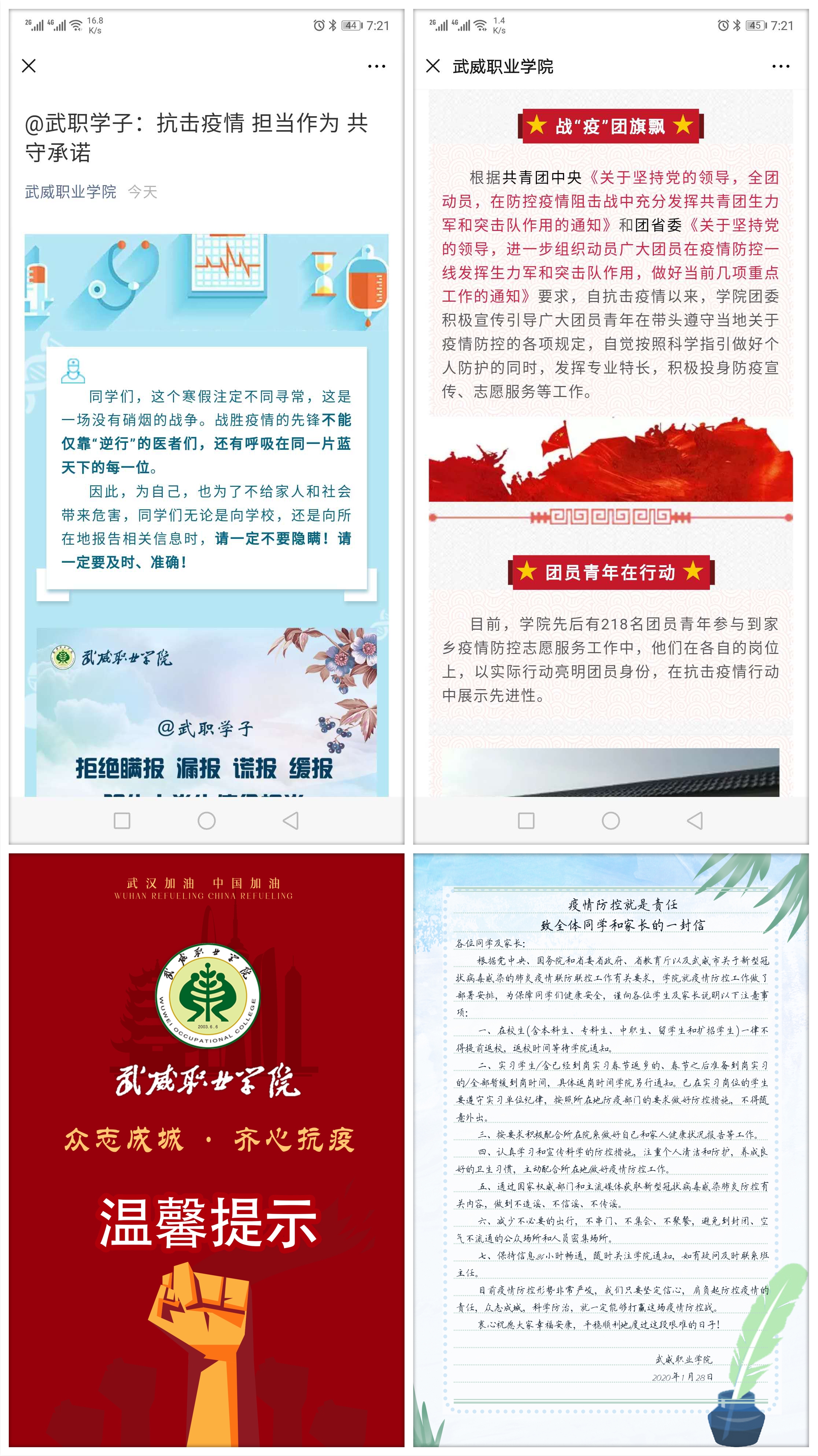 学生工作处及时发布了致学生和家长的一封信《疫情防控就是责任》,团委制作和推送了《春暖花开疫情散 我们武职再相见》温馨提示短片和《@武职学子:抗击疫情 担当作为 共守承诺》倡议,用生动形象的表述要求和提醒同学们不得提前返校,做好个人防护措施,遵守当地疫情防控各项要求,做到不信谣不传谣,及时向学院报送个人防疫相关信息,不瞒报不慌报。各院系辅导员和班主任都会第一时间在学生群里转发,同时把学院网站和微信平台上科学的防控知识和上级的有关精神及时传达给学生,当好疫情防控的宣传员,做到战疫有“力”。