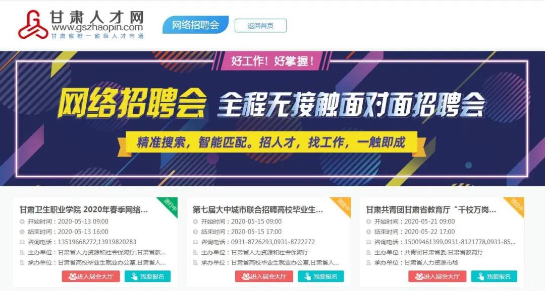 为应对新冠肺炎疫情冲击,加大高校毕业生就业服务力度,进一步做好高校毕业生就业服务工作,甘肃省高校毕业生就业办公室、甘肃省人力资源市场定于2020年5月15日联合甘肃省内部分高校在甘肃人才网(www.gszhaopin.com)举办“第七届大中城市联合招聘高校毕业生春季网络视频专场招聘会‘甘肃站’”活动。