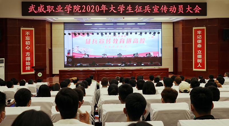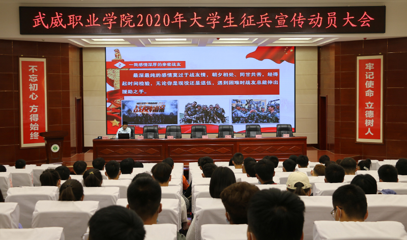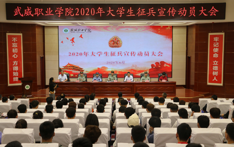 6月10日上午,学院2020年大学生征兵宣传动员大会在菁英厅举行。武威军分区司令员张国辉、武威军分区动员处处长刘忠、凉州区人武部部长阚延贵、凉州区人武部政委丁俊强,学院党委书记、院长赵明,副院长何毅出席会议。各院系负责人、辅导员和学生代表共200人参加了会议。会议由副院长王守云主持。