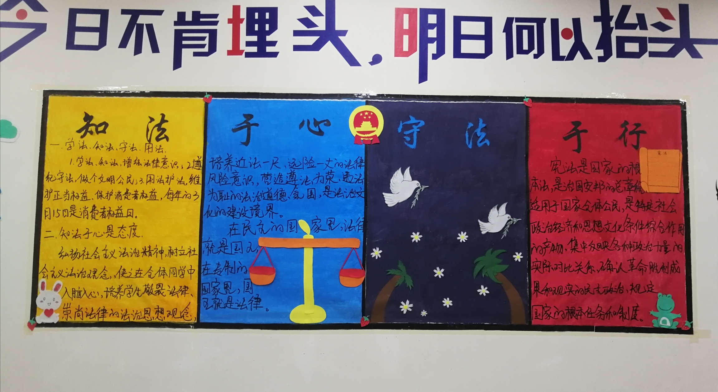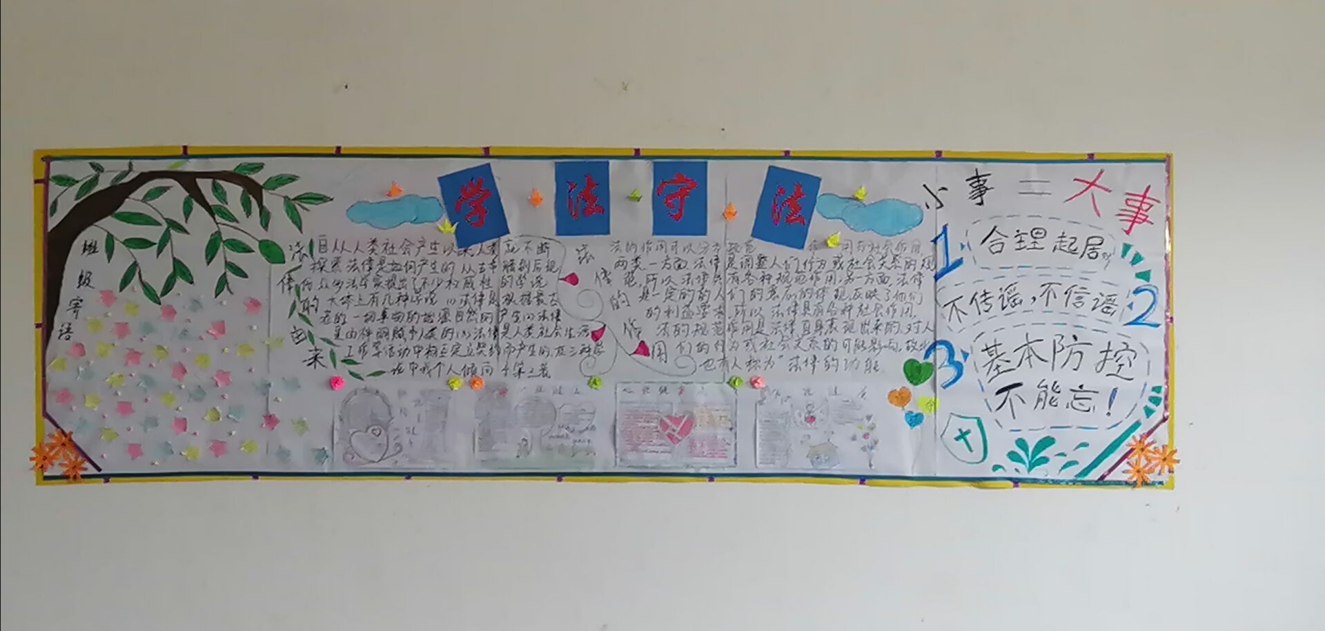 此次主题板报活动的开展,进一步充实了板报的宣传教育功能,展现了我系学子良好的精神风貌,培养了大学生知法守法的优良品质,营造了健康、积极进取的学风,更加提升了学生的法律常识。我系将借此活动为契机,加强我系学生的法律道德意识,引导我系学生知法于心,守法于行。