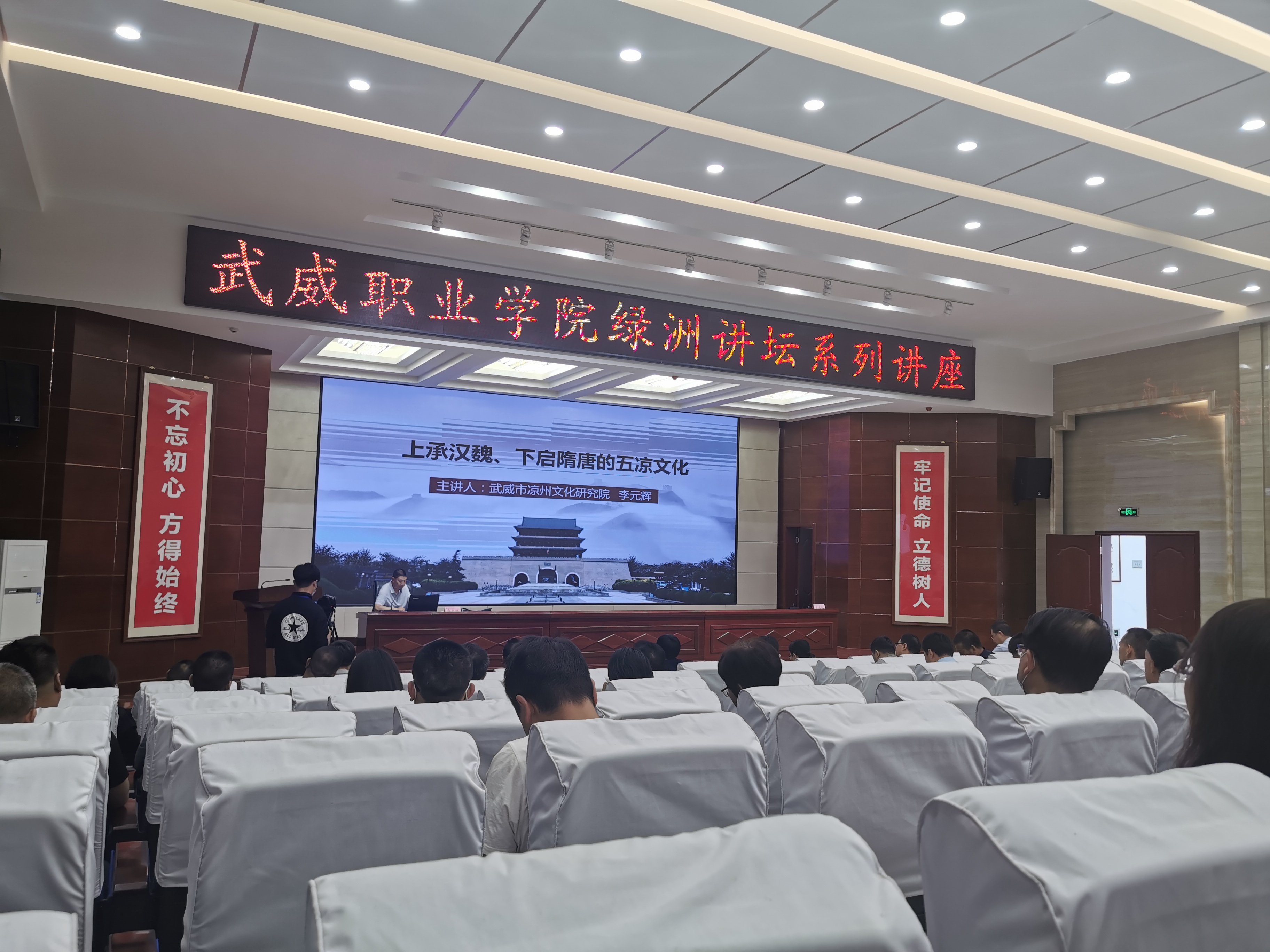 6月12日上午,学院第34期“绿洲讲坛”在菁英厅举办,邀请武威市凉州文化研究院研究员、凉州文化研究资深专家李元辉作题为《上承汉魏,下启隋唐的五凉文化》的专题报告。莅临报告会的有凉州文化研究院副院长王守荣同志,凉州文化研究院文史工作者柴多茂、赵大泰、杨琴琴等同志。学院领导、中层干部和师生代表共150人聆听了报告。报告会由学院党委副书记翟存祥主持。