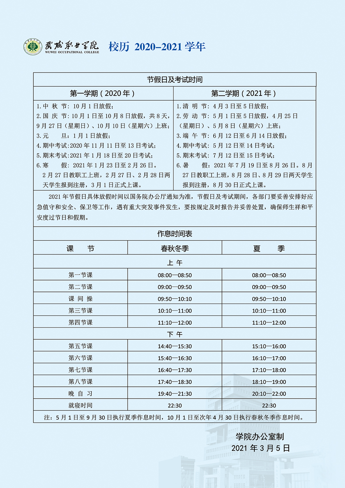 武威职业技术大学位于中国旅游标志之都、中国葡萄酒城、全国历史文化名城、最美中国文化旅游城市——武威,是国家骨干高等职业院校、省级双高校、省级示范校、省级优质校。