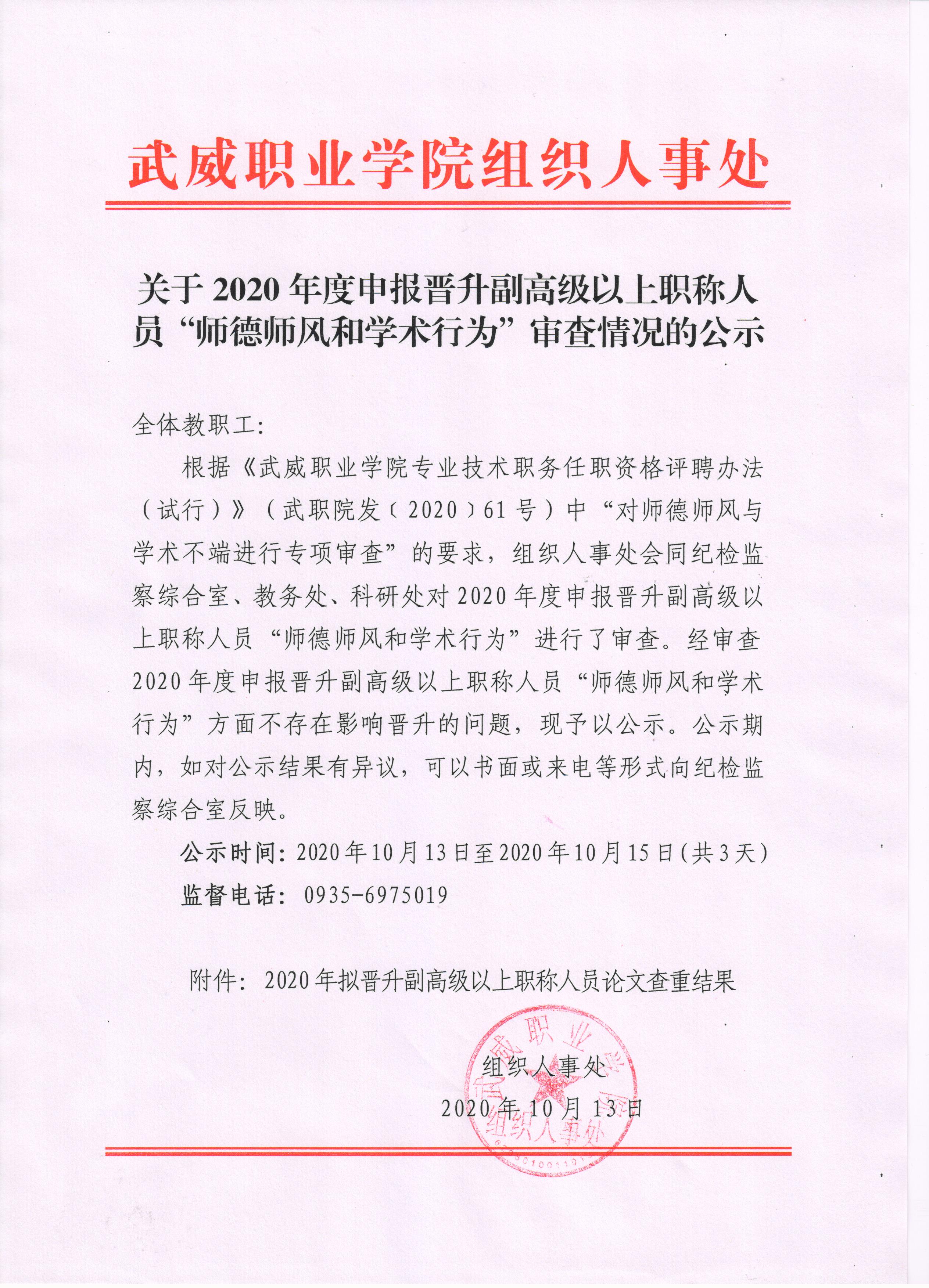 关于2020年度申报晋升副高级以上职称人员“师德师风和学术行为”审查情况的公示