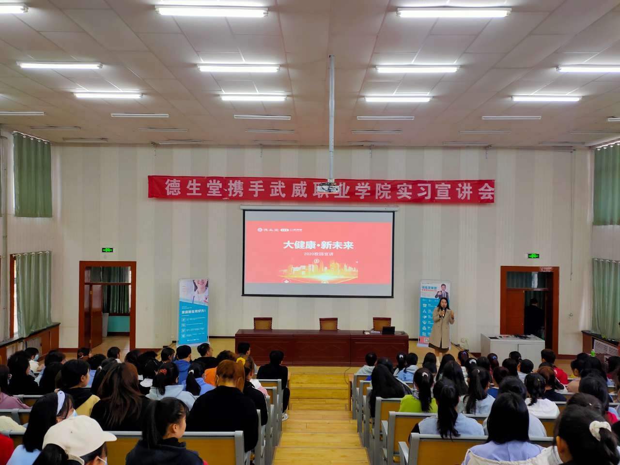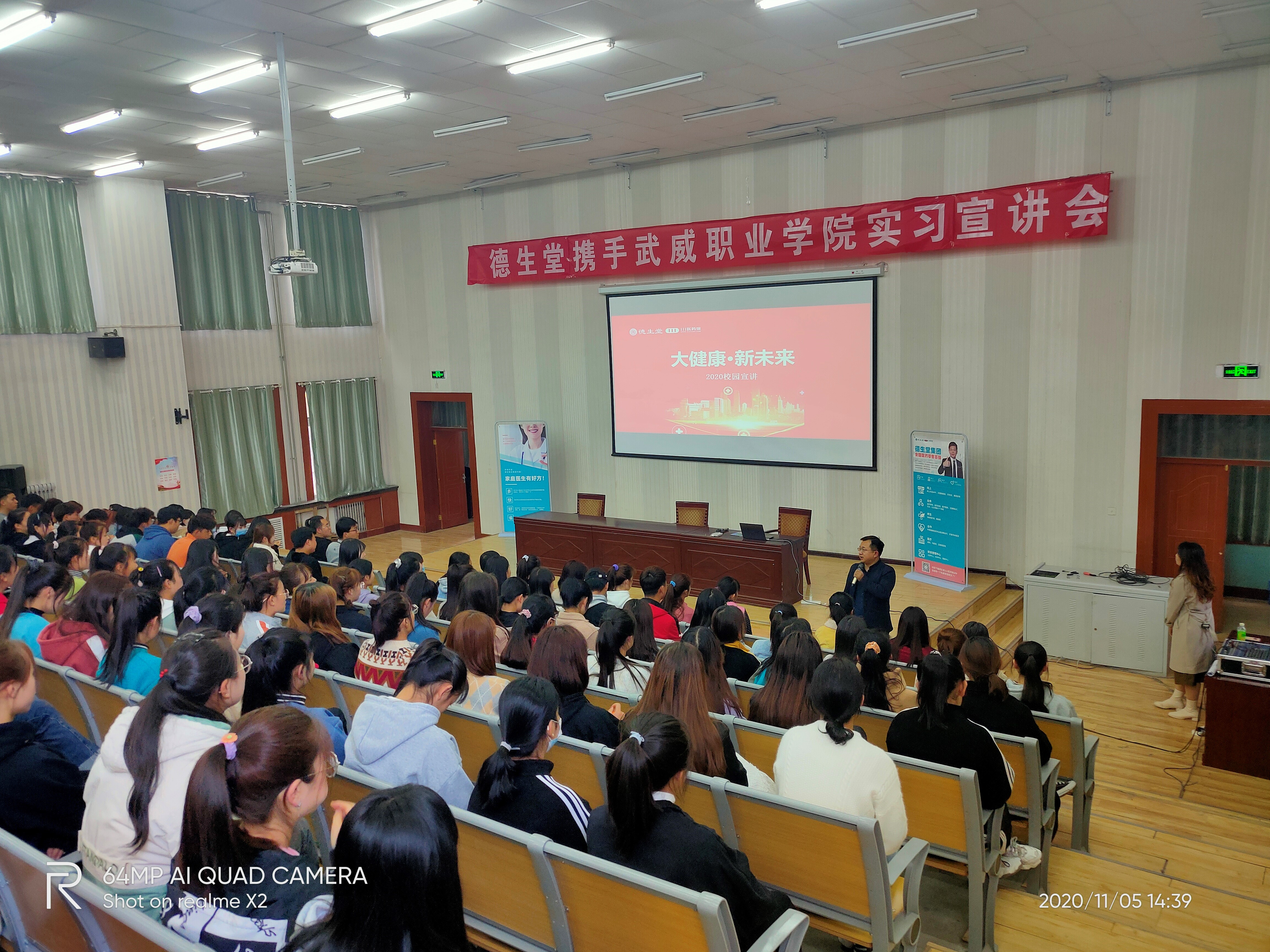 2020年11月5日,武威职业学院药学系携手德生堂在正德厅举办实习宣讲会。药学系党总支书记、主任魏润明、药学系副主任杨建美、德生堂集团武威区域经理吕福英及2021届172名毕业生参加宣讲会。