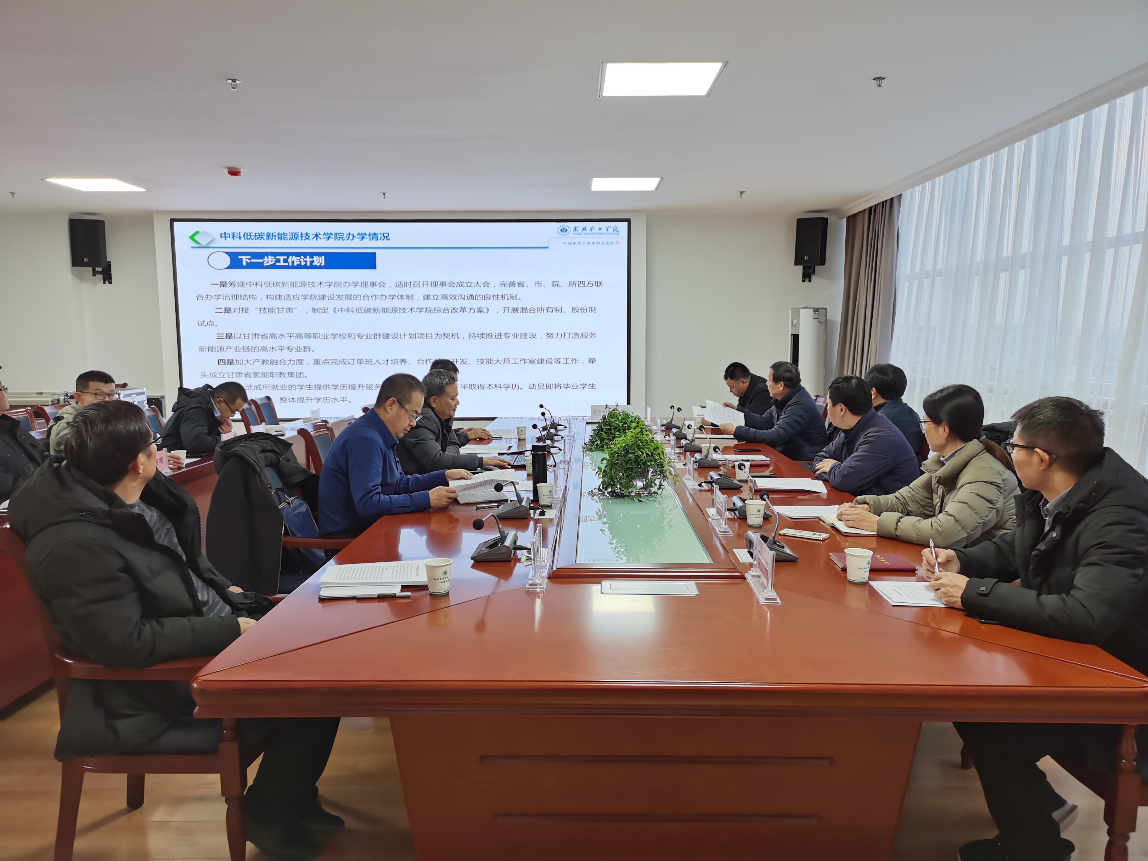 参观结束后,学院在能源科技楼811会议召开了中科低碳新能源技术学院工作座谈会。会上,赵明介绍了学院整合教学资源建设发展历程、党的建设、优质校建设、专业建设、合作办学、师资队伍建设、招生就业、科研服务、对外交流、校企合作和“双高”院校创建等情况。重点就中科低碳新能源技术学院建设发展、专业申报、实验实训室建设、教育教学、人才培养和下一步工作计划等情况进行了详细介绍。