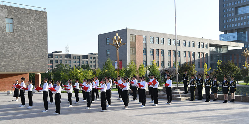 迎着朝阳,英姿飒爽的国旗护卫队踏着矫健的步伐护送国旗抵达升旗台,鲜艳的五星红旗在雄壮的国歌声中冉冉升起,全场师生齐唱中华人民共和国国歌,飘扬的国旗、嘹亮的国歌,激荡起每个人强烈的爱国热情。青年代表们在国旗下致献词,对党许下青春的誓言,在献词最后,青年们连呼四遍“请党放心,强国有我”,誓言铿锵、久久回荡。最后,全体师生挥动手中的五星红旗齐唱《歌唱祖国》,用歌声共同祝福伟大的祖国繁荣富强。