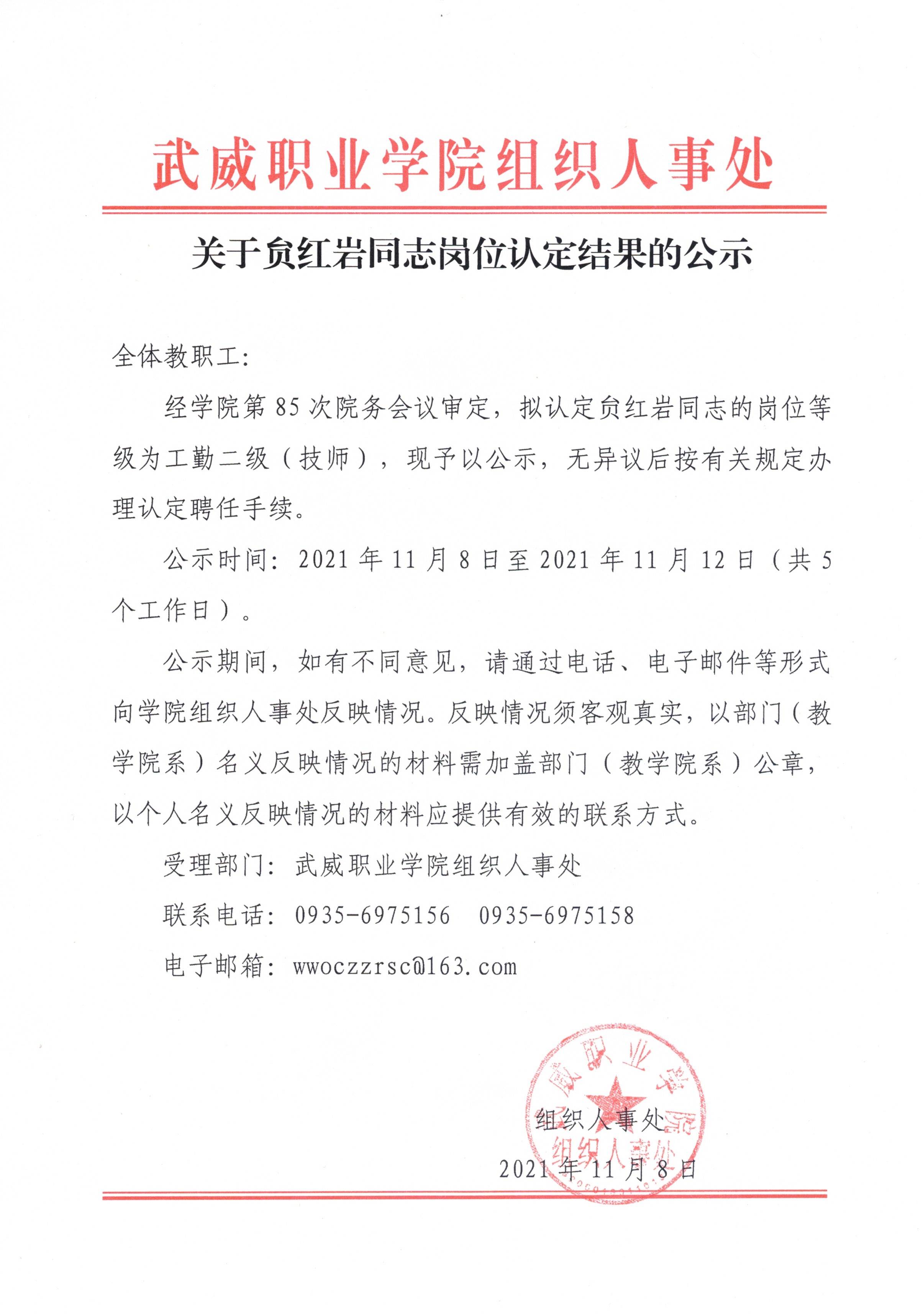 关于贠红岩同志岗位认定结果的公示