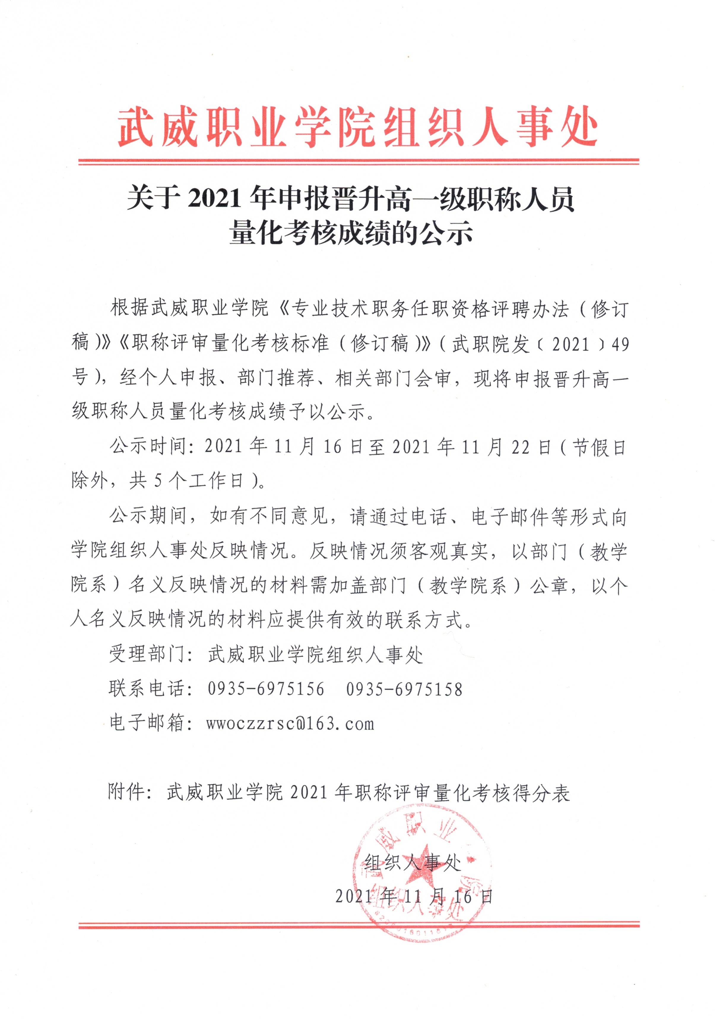 关于2021年申报晋升高一级职称人员量化考核成绩的公示
