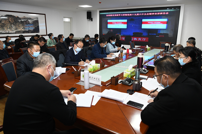 11月29日下午3点,全省教育系统学习贯彻党的十九届六中全会精神专题宣讲报告会在省教育厅二楼视频会议室召开,学院以视频会议方式设分会场,学院院领导班子成员,马克思主义学院思政课教师代表,党史学习教育领导小组办公室人员,各部门、教学院系主要负责人及部分师生代表参加视频会议。
