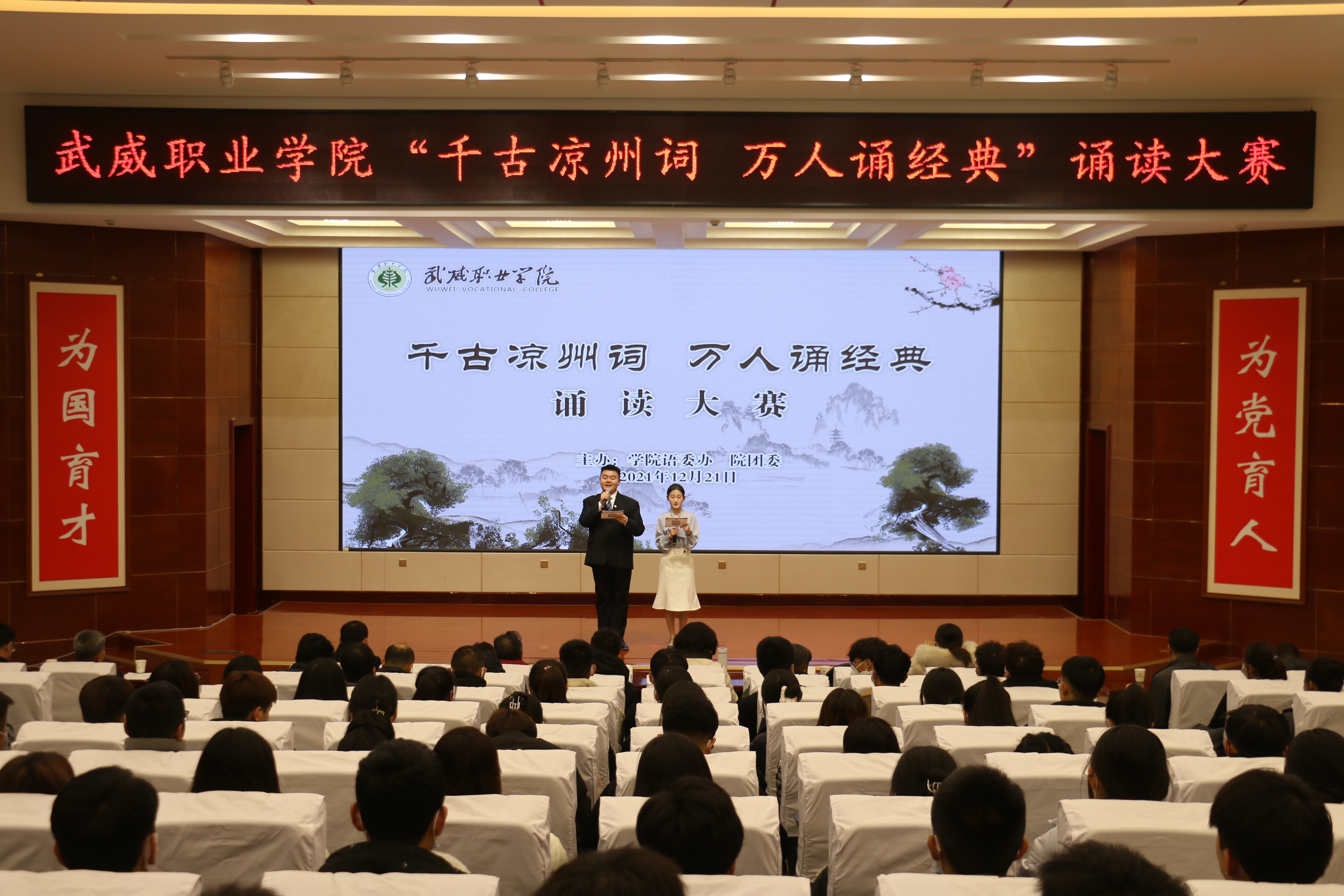 为深化党史学习教育,推进“双高计划”建设任务,弘扬凉州文化,传承丝路精神,助推全国文明城市创建,营造书香校园氛围,12月21日晚,学院“千古凉州词 万人诵经典”诵读大赛在菁英厅举办,学院党委书记、院长赵明,党委委员、副院长张开礼,党委委员、副院长王守云出席活动,各分团委书记及学生代表250余人观看比赛。