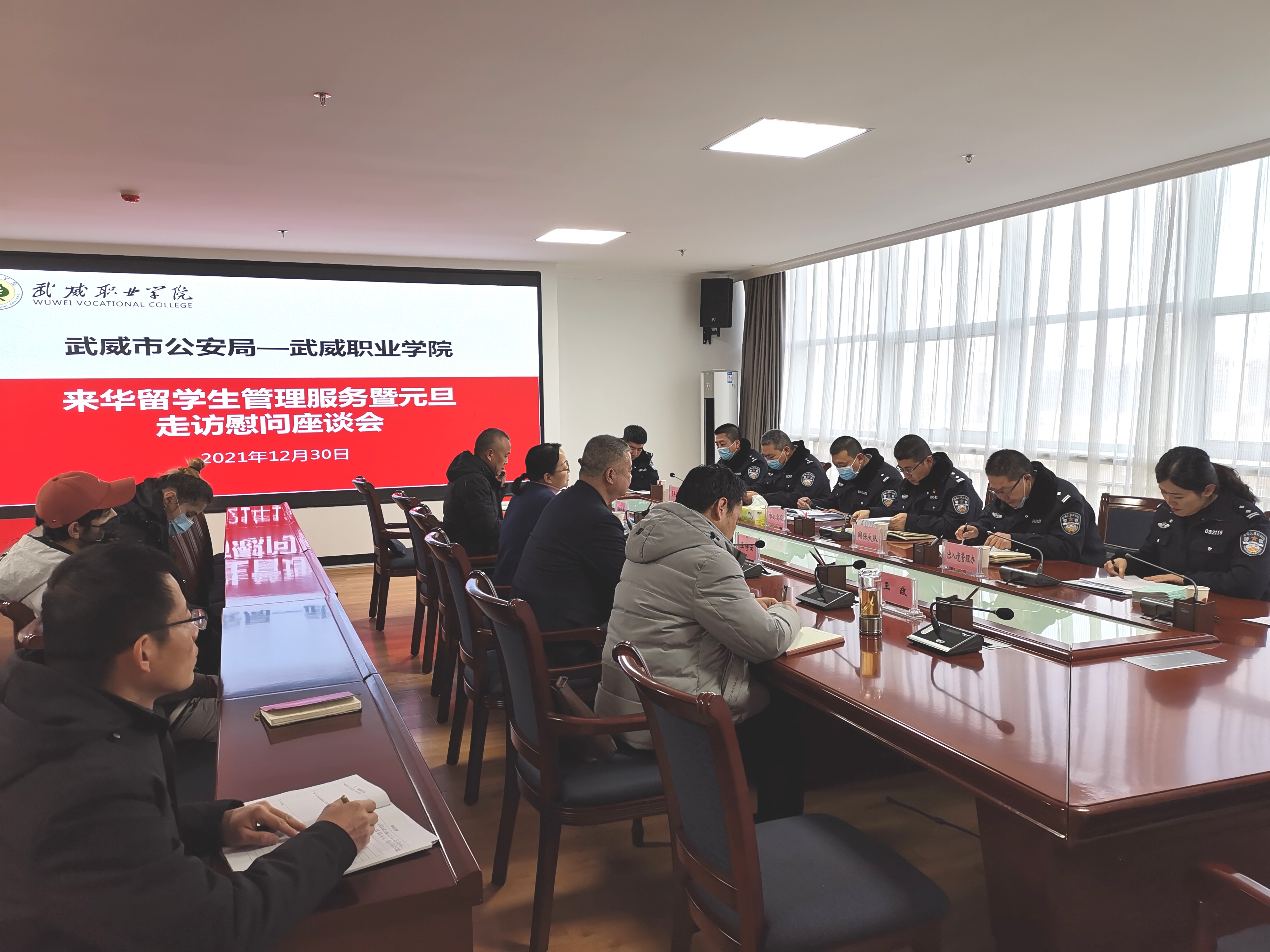 12月30日上午,市公安局出入境管理科、非政府组织管理办公室,市公安局凉州分局国安大队、反恐大队、出入境管理办公室、凉州分局西关街派出所一行十一人到访学院,开展来华留学生管理服务暨元旦走访慰问活动。党委委员、副院长田迎春、王守云出席活动。国际合作与交流处处长潘从民、保卫处处长王政及相关人员,2019级、2021级在华留学生参加活动。田迎春主持活动。